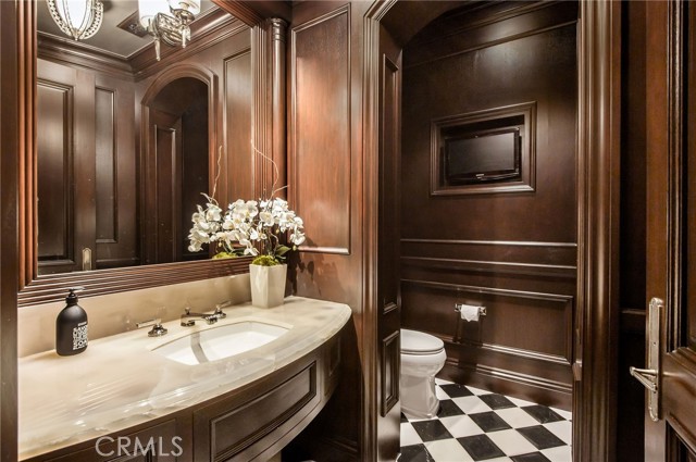 The first level includes a billiards room with a coffered ceiling, wet bar, three TV’s, and a built-in humidor cabinet with lighted cigar display. This level also includes a wine cellar with tasting room, a home theater, a guest bedroom, and access to a large garage that can accommodate up to 8 cars with an automated vehicle turntable for ease of parking. The garage has floor-to-ceiling cabinetry, a storage room and a workbench area.