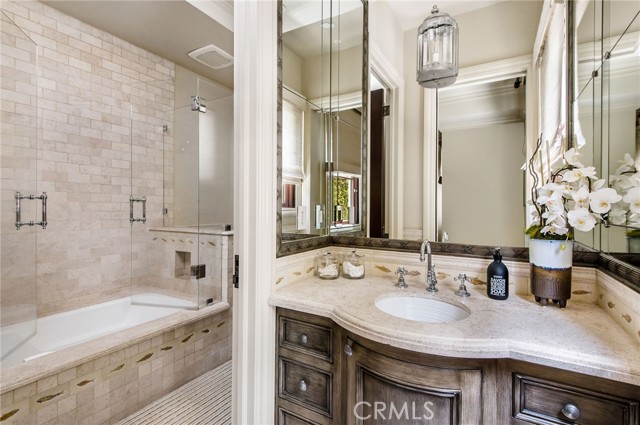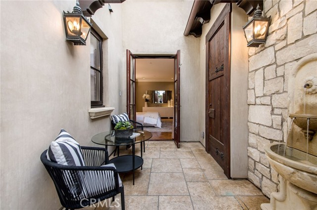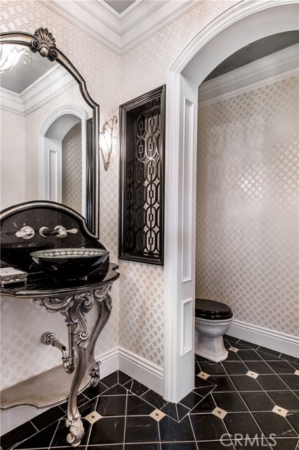 The next level encompasses the main floor with a formal entry, a grand spiral staircase and four bedrooms. The primary suite offers a split-level space with adjoining sitting room, two fireplaces, separate walk-in closets and a private outdoor terrace with a water fountain and gym room. This level also includes a laundry room, a computer alcove, and a family room that opens up to an outdoor pool deck surrounded by lush greenery with a heated, salt-water pool and fountain feature, a spa, outdoor shower, basketball half-court and outdoor fireplace.