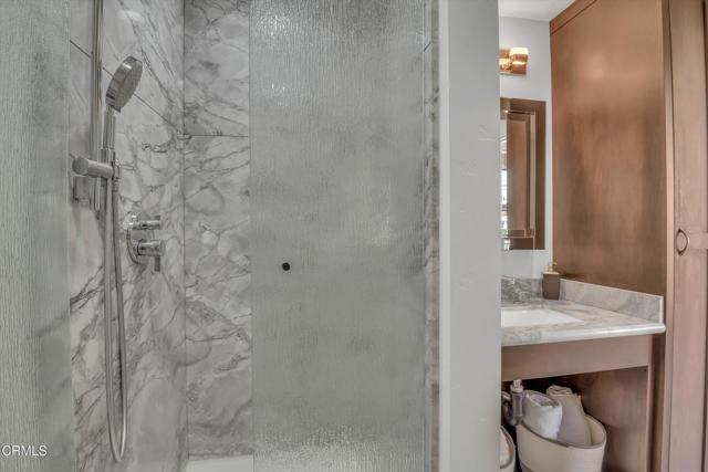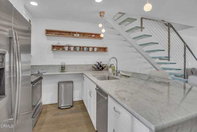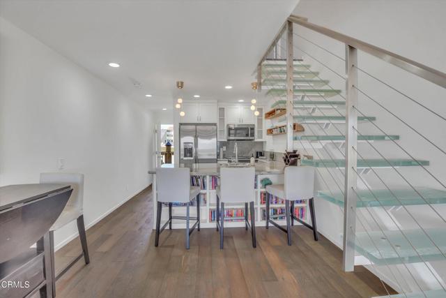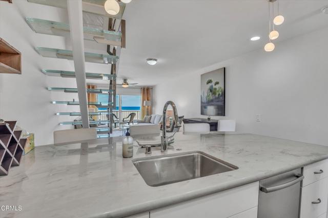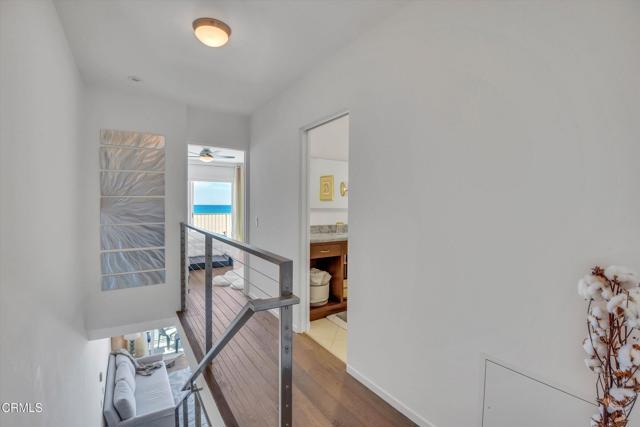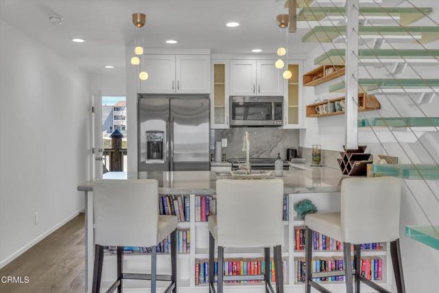 Experience coastal living at its finest in this stunning 2-bedroom, 1.75-bath, two-story condo located in the gated Surfside I community, directly across from the beach and pier in Port Hueneme. Completely upgraded from floor to ceiling, this one-of-a-kind home showcases tasteful, high-end finishes and breathtaking design throughout.From the moment you step through the front door, you are greeted with unobstructed 180-degree ocean views that immediately captivate. The main level features an open living and dining area with direct access to a private balcony, perfect for enjoying the ocean breeze and sunsets. The beautifully remodeled kitchen offers a huge peninsula, quartzite countertops, custom cabinetry, and stainless steel appliances, blending functionality with modern elegance. Also on the main level are a three-quarter bathroom with limestone tile on the floor and wall, marble on the countertop and shower wall enclosure, a dedicated laundry area with side-by-side front-loading side by side washer and dryer, and ample storage.Upstairs, you'll find two bedrooms and a full bathroom featuring a jetted tub, limestone tile floor and tub wall, marble countertop and tub enclosure. The primary bedroom offers its own private balcony with sweeping ocean views, creating a serene retreat. The guest bedroom includes a separate private entry/exit, ideal for added flexibility.Additional highlights include bleached oak flooring throughout, mosaic marble flooring on both balcony decks, ceiling fans in the living room and both bedrooms, and a striking staircase with cable railing and custom glass steps that adds a modern architectural touch.This exceptional property combines luxury, comfort, and an unbeatable beachfront location--truly a rare opportunity to own a turnkey ocean-view condo.