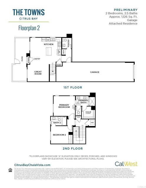 This stunning new 2-story townhome in the vibrant Citrus Bay community of Chula Vista is ready for move-in and packed with style. It features 2 spacious bedrooms, 2.5 modern bathrooms and 1,126 square feet of living space. Enjoy a private patio with vinyl fencing and a gate, perfect for outdoor entertaining. The 2-car garage features tandem parking and extra space for storage. The home has beautiful finishes throughout-including sleek white soft-close cabinetry, quartz countertops with full herringbone pattern tile kitchen backsplash, 5-burner gas range, microwave hood, dishwasher, built-in trash/recycle bin and upgraded flooring (luxury vinyl plank flooring on the entire first floor, with ceramic tile & carpet in bedrooms/baths). Just steps from the scenic bay and near the Luxurious Gaylord Pacific Resort, this home places you in the heart of Chula Vista with walkable access to restaurants, the Chula Vista Center Mall, and more. Beyond the home itself, the community offers a beautiful sparkling pool, BBQ area and a future Citrus Bay park, perfect for downtime or playtime with family and friends. Brand new construction; photos represent the professionally decorated model home.