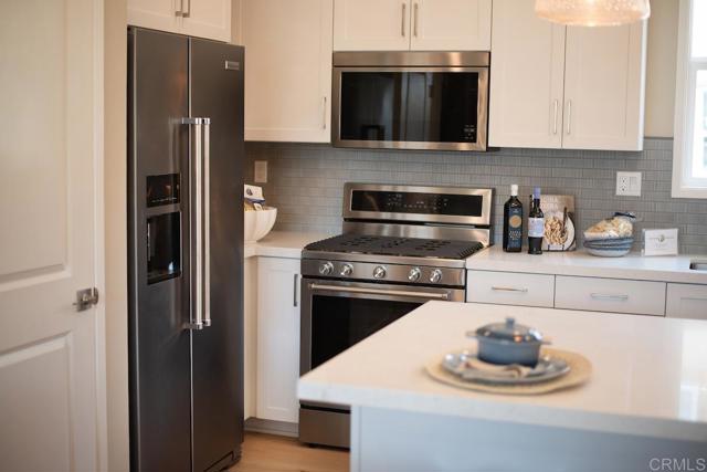 This stunning new tri-level home in the vibrant Citrus Bay community of Chula Vista is ready for move-in and packed with style. This home features 3 bedrooms, 2.5 bathrooms, a generous deck, large living/kitchen/dining area and an attached 2 -car garage. The home has beautiful finishes throughout-including sleek white cabinets/drawers with "soft-close" technology, quartz countertops with full kitchen tile backsplash, SS appliances including a 5-burner gas range, microwave/hood & dishwasher. The first & 2nd floors feature beautiful luxury vinyl plank flooring, with upgraded carpet and tile in the other areas. Just 1 mile from the luxurious Gaylord Pacific Resort, this home places you in the heart of Chula Vista with walkable access to restaurants, the Chula Vista Center Mall and more. Beyond the home itself, the community offers a sparkling pool, BBQ areas and a future lush park, perfect for relaxing with family and friends. Photos show the professionally decorated model home.
