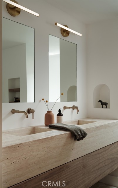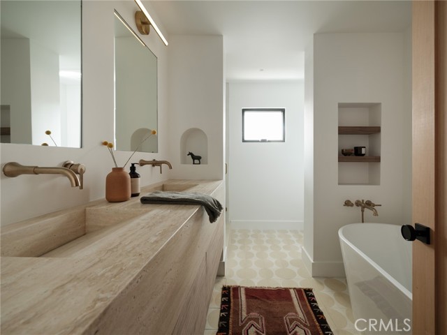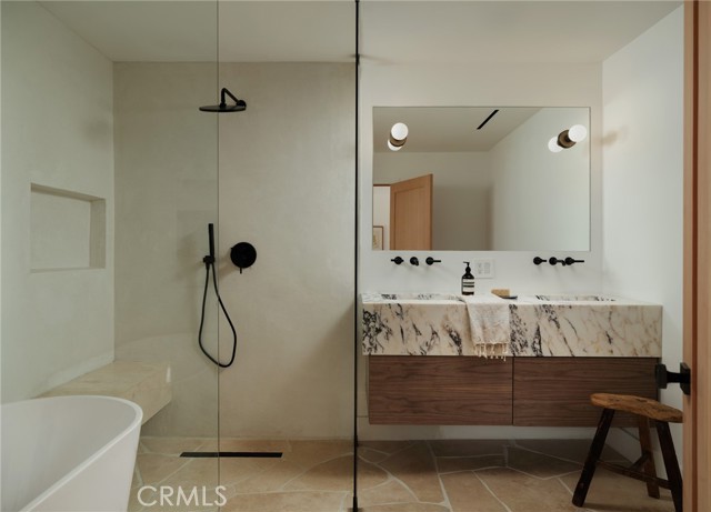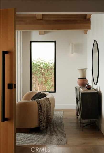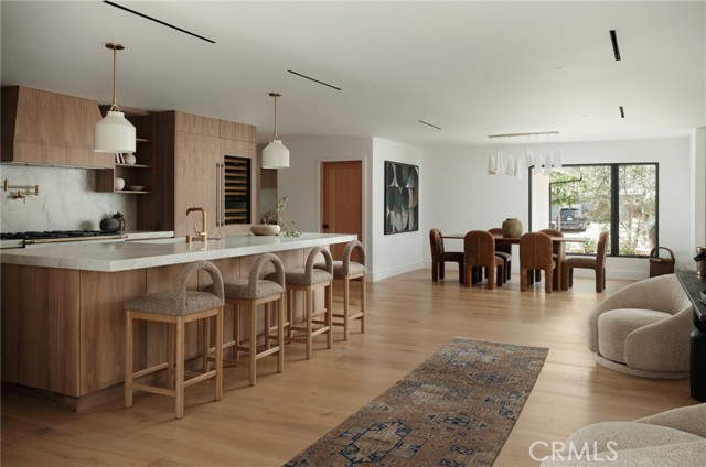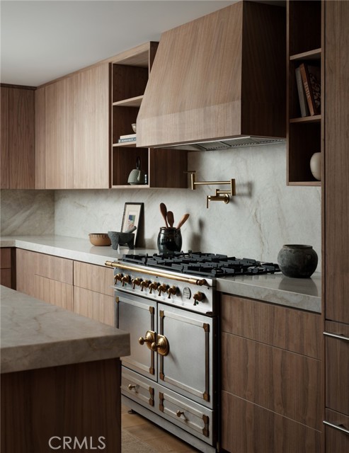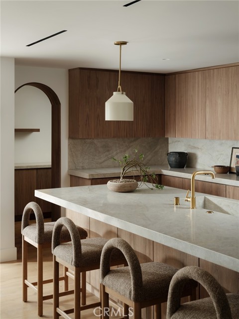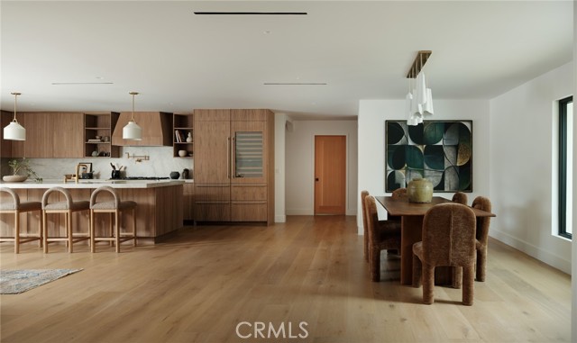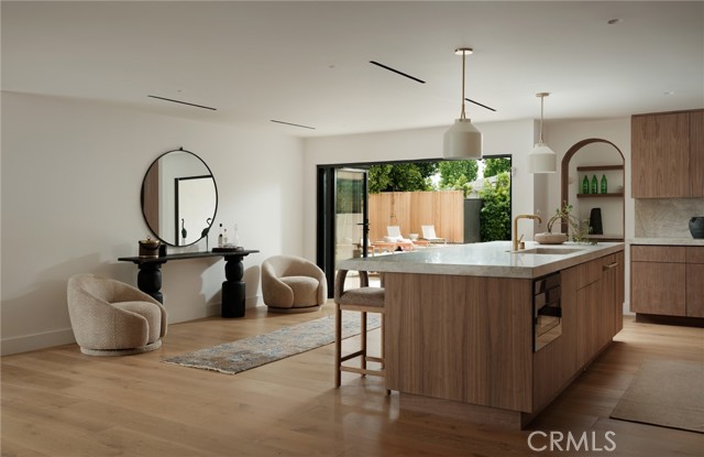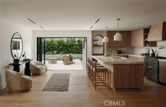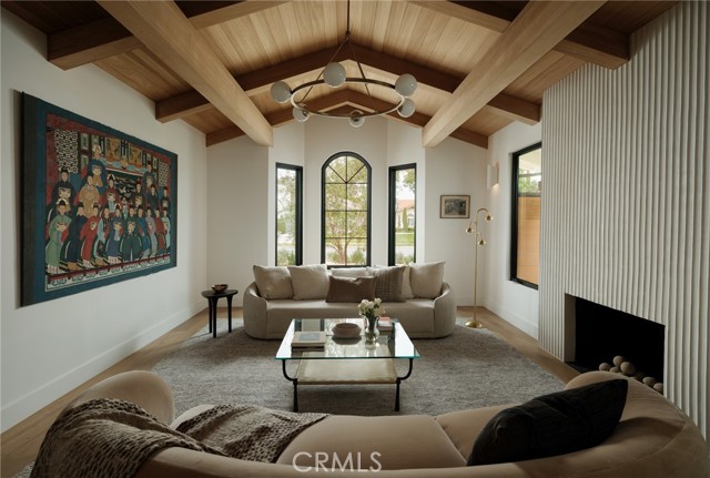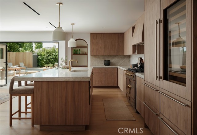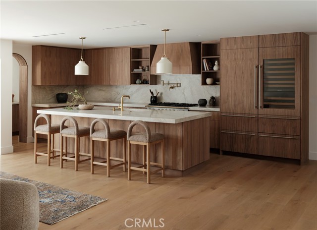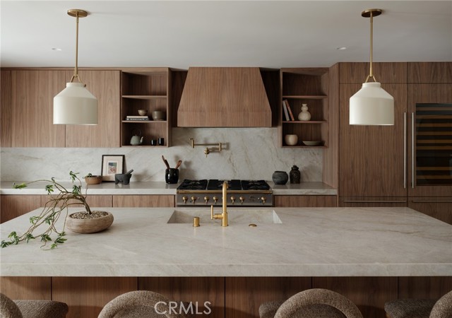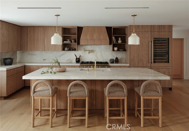 Quietly set on Windward Lane, this newly reimagined coastal residence is an exercise in restraint, craftsmanship, and warmth—where timeless materials meet modern California living. Designed in collaboration with a renowned Los Angeles builder and a respected interior studio, the home unfolds with intention, balance, and an unmistakable sense of calm.At the center is a sculptural kitchen wrapped in knot-free, book-matched black walnut, anchored by Taj Mahal stone that flows seamlessly across the counters and into an integrated stone sink. Paneled Sub-Zero Designer Series refrigeration, wine and cigar display, a statement LaCornue 110 range, and a custom walnut pantry elevate the space while preserving its quiet sophistication.The living room is grounded by a fully enclosed wood ceiling and a custom fluted fireplace, creating a warm architectural moment that invites both gathering and pause. Wide-plank nine-inch wood floors, casement windows, linear vents, and curated lighting carry a consistent design language throughout, while four expansive sliding and stacking door systems dissolve the boundary between indoors and out. Bathrooms echo the home’s natural palette with walnut vanities, thick-edge stone surfaces, integrated sinks, wall-mounted faucets, lime-washed plaster accents, and Duravit wall-hung fixtures. The primary bath is finished in hand-laid travertine flagstone, offering a spa-like retreat rooted in texture and craft.Beyond aesthetics, the home has been comprehensively rebuilt with a standing-seam metal roof, brand-new dual-zone HVAC, all-new plumbing, sewer lines, drains, and complete electrical—delivering modern infrastructure with timeless appeal.Outdoors, mature fruitless Manzanillo olive trees, lavender and rosemary plantings, privacy hedging, and a full drip system frame a serene backyard setting. A limestone patio, custom wood decks, and a pool finished in stacked white Zellige tile create an intimate coastal escape, complemented by thoughtfully layered exterior lighting.This is a home designed to be felt—quietly refined, deeply considered, and perfectly attuned to the California lifestyle.