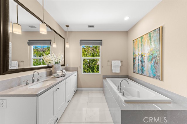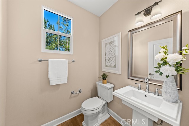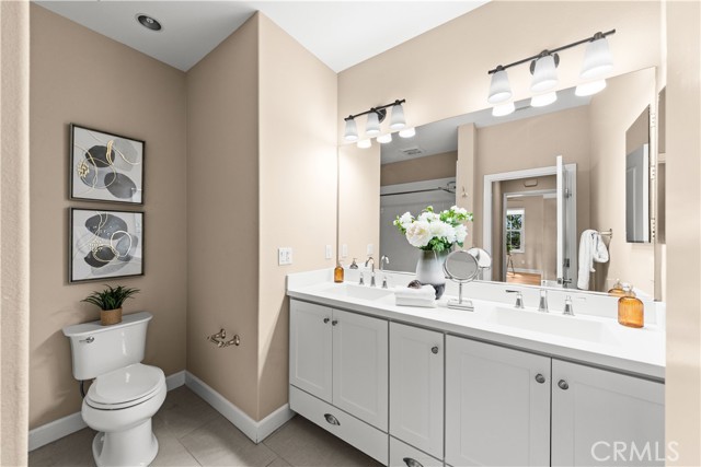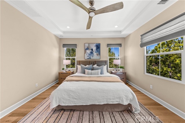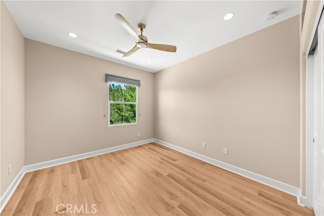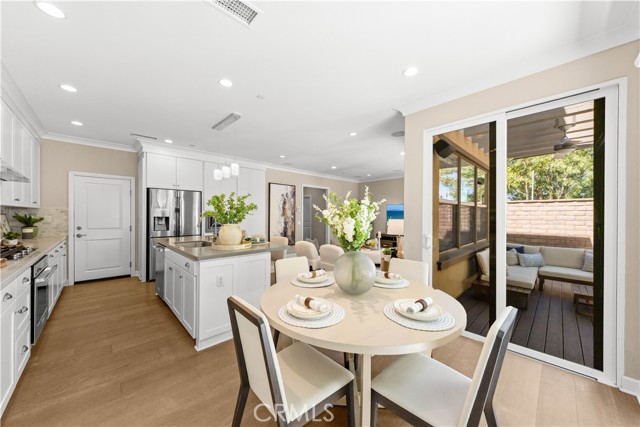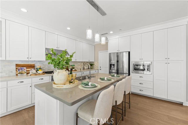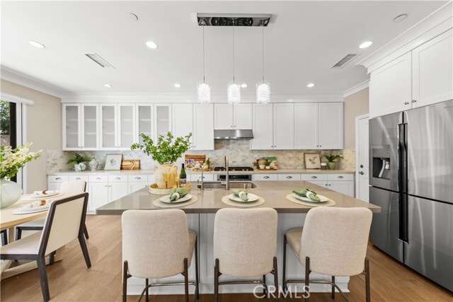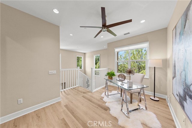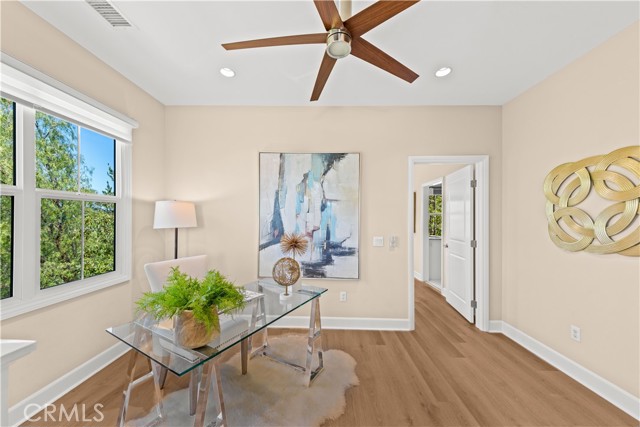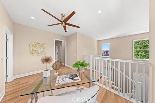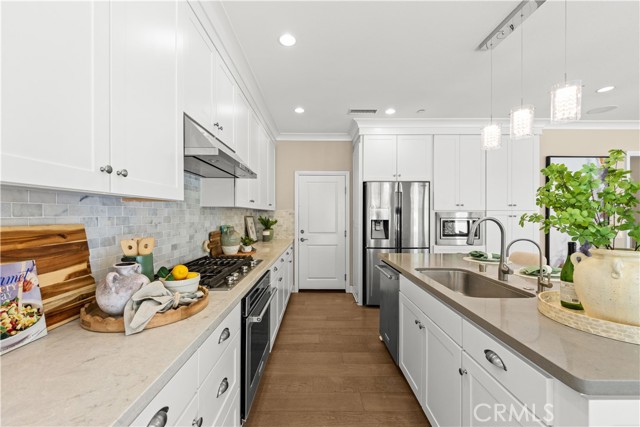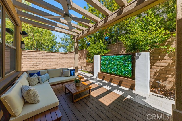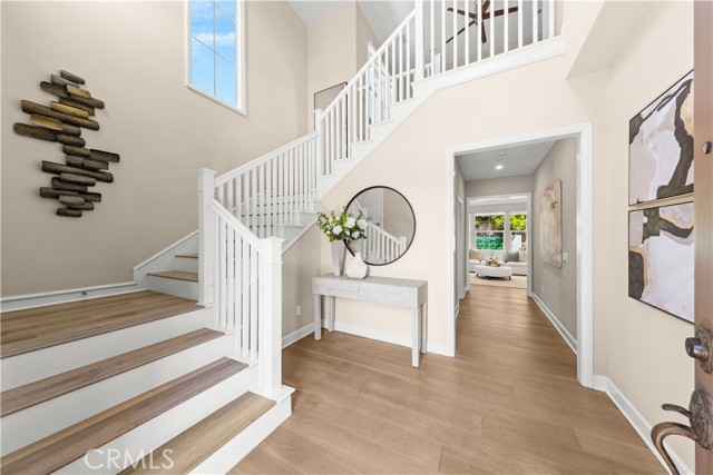Premium location corner lot with driveway in the highly desirable Orchard hills community! This nicely upgraded home features 3 bedrooms and 2.5 baths plus a loft, 1914 sqft living space, the largest floorplan in this neighborhood. Upon entry you will be impressed by the foyer with high ceiling and elegant staircase. Very bright and light, open floor plan, recessed light, custom paint, and wood flooring throughout. Spacious living room with in-ceiling surround sound speakers and Hunter Douglas window shades with automated controls. Beautifully designed gourmet kitchen with a large island, quartz countertop, KitchenAid stainless steel appliances, microwave, gas cooktop, oven, and dishwasher. Dining room with built-in cabinets, extra space for storage, and glass door cabinets for your display of favorite collections. Sliding door opens to the private backyard, designed with Trellis, Trex decks and tile flooring, outdoor TV and speaker system all pre-wired, perfect for gatherings and entertainment. Upstairs, an open loft provides a versatile secondary living area ideal for a media room or study space, with nice and tranquil views. You may also enjoy the view from the spacious primary bedroom, bathroom with double sinks, framed mirror, nice pendant lights, tub, and exquisitely designed shower room. Two secondary bedrooms, hallway bathroom with double sinks and tub. Attached two-car garage with epoxy flooring and extra storage cabinets. Close to award-winning Irvine schools. Resort-style community amenities include swimming pools, club house, tot lot, barbecue and picnic table, basketball court, etc. This house is a must see!