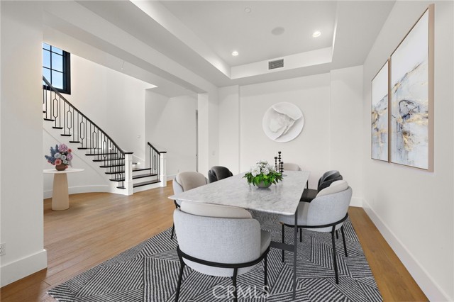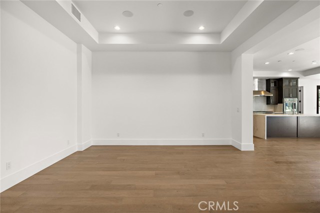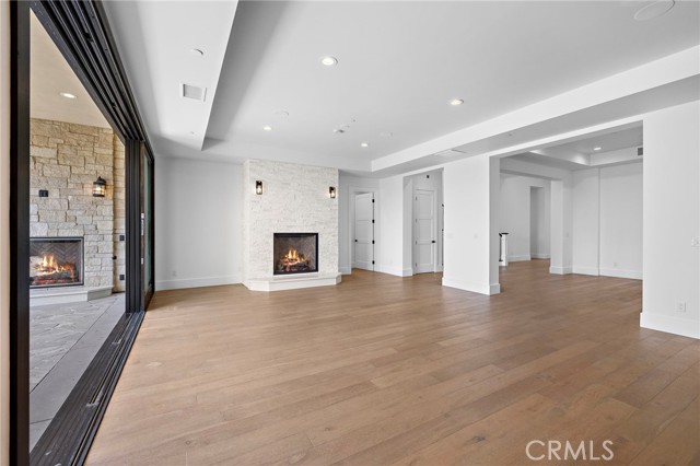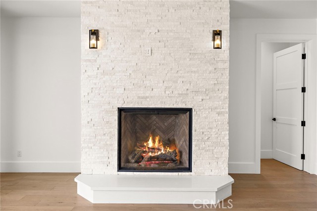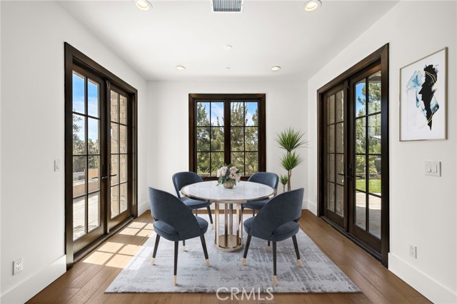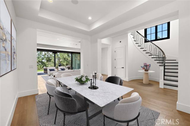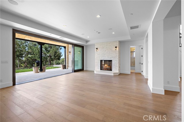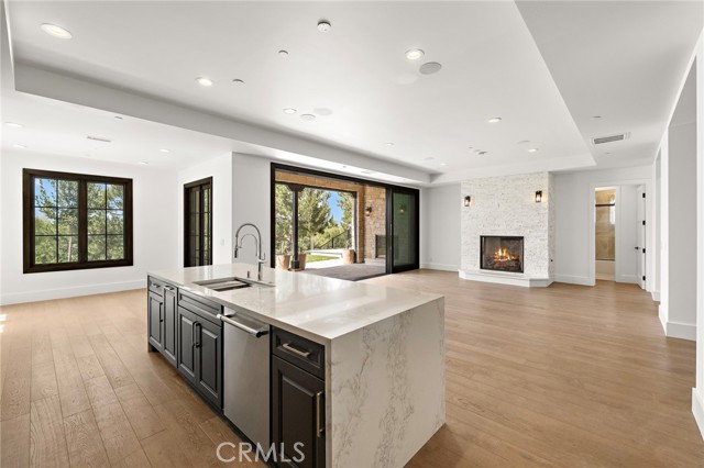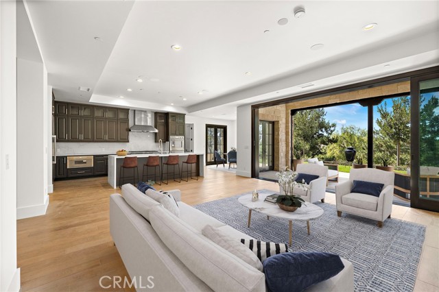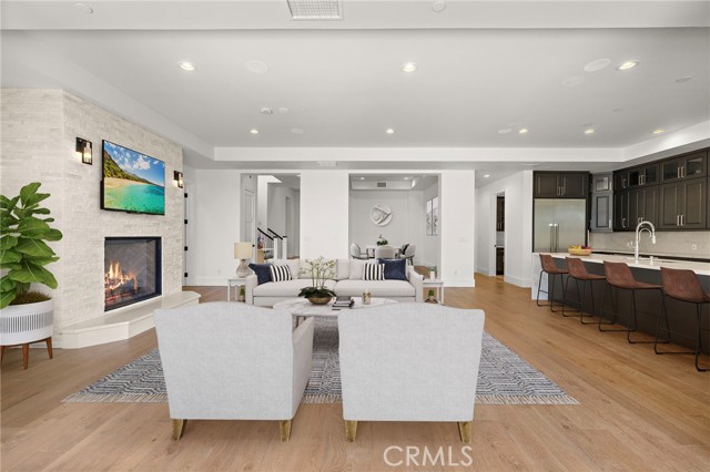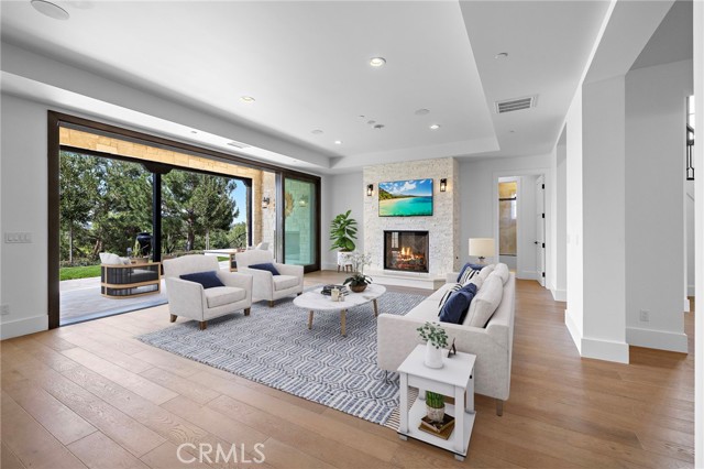 A meticulously curated landscape creates a striking first impression. Inside, approximately 4,090 square feet of refined living space blends grandeur with everyday comfort. The expansive great room showcases natural wood floors, an 8-zone surround sound system with whole-house monitoring and single-app control, and a warming fireplace. California doors create a seamless indoor-outdoor connection. Designed for both luxury and efficiency, the chef’s kitchen features premium Thermador appliances, a walk-in pantry, custom cabinetry, and a spacious dine-in area—ideal for casual mornings or elevated entertaining.