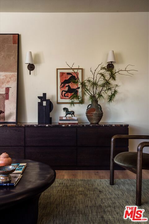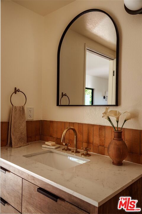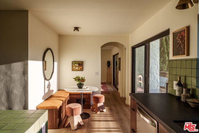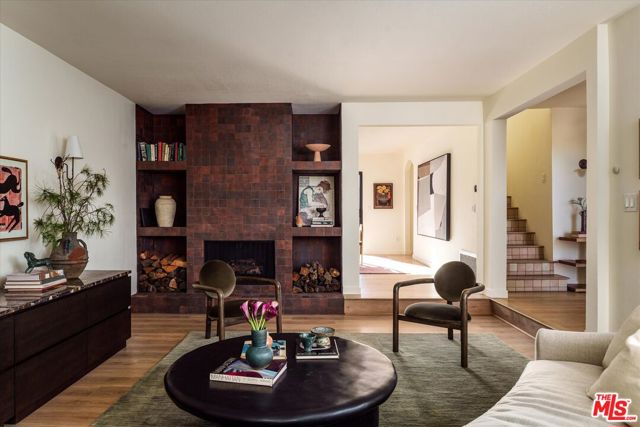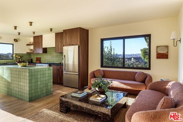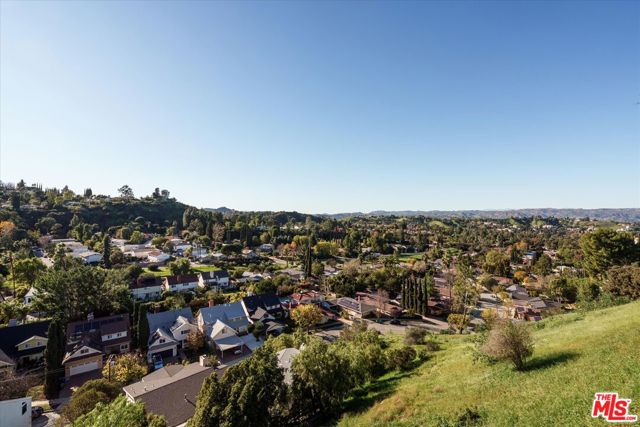 Turn-key Spanish hills home with panoramic views from every window, privacy, and great natural light south of the Boulevard. The designer reimagined home is set back off the street featuring stylish touches and high end finishes tucked away yet just a short drive to Ventura Blvd. New flooring, bespoke light fixtures and hardware, new Milgard windows and sliding glass doors, and an assortment of beautiful tiles adorn this one of a kind home. The kitchen has leathered granite countertops, walnut cabinetry, bronze hardware, brass light fixtures, all new appliances, accented by a built-in breakfast nook overlooking the hillside and adjacent lounge area. Off the kitchen is a large deck with room for dining and lounging. A classic Spanish step down living room lit by wall sconces and a tiled double sided wood burning fireplace is flanked by the generous formal dining room also with hillside views, and additional den or office downstairs. Upstairs the large primary bedroom suite features its own balcony with mountain and tree views, walk-in closet, and an en suite bathroom clad in limestone, cement, and walnut. Three additional guest bedrooms upstairs and guest bathroom with double vanity, soaking tub, and unlacquered brass hardware are complemented by a built-in reading nook at the top of the staircase framed by a large window and skylight. The backyard features a large outdoor entertaining area with a built-in BBQ and hot tub all in complete privacy with 180 degree deep views of the surrounding green hillsides. Gardens areas below, and additional green spaces and gardens flank both sides of the house. Direct entry two car garage and just a short drive to markets, restaurants, coffee shops, hikes, and more at the bottom of the hill. A stunning, unique designer Los Angeles hills home in Woodland Hills.