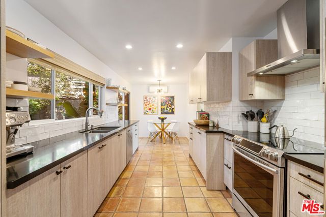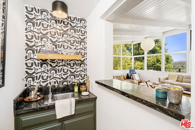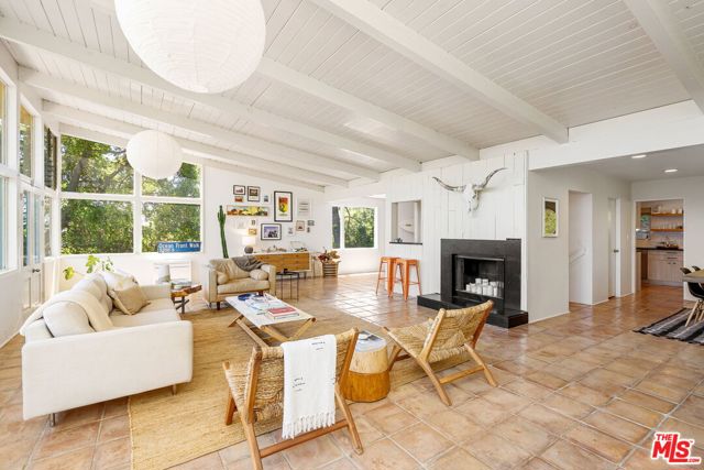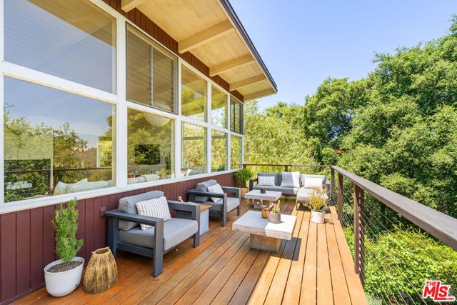 Tucked away in the serene Topanga Mountains, this 2-bedroom, 2-bathroom home offers a peaceful retreat with stunning views. The interior boasts an oversized living room with pitched wood-beam ceilings, a cozy fireplace, a bar area, and an impressive wall of glass windows and doors that open to an expansive deck overlooking verdant treetops, canyons, and hills beyond. The dining room flows into a modern chef's kitchen equipped with stainless steel appliances, a subway tile backsplash, exposed shelving, ample cabinet space, and a breakfast area. The primary bedroom is a haven of relaxation with a walk-in closet and glass doors showcasing serene views of mature trees. The modern primary bathroom features a soaking tub, separate glass shower, and dual-sink vanity. Additional highlights include a spacious guest bedroom, polished concrete and Saltillo tile flooring, an abundance of windows and natural light, and a tiered backyard with two different outdoor spaces. A peaceful escape from the hustle and bustle of city life, yet close to everything Los Angeles has to offer, don't miss the opportunity to call this Topanga Canyon sanctuary your own.
