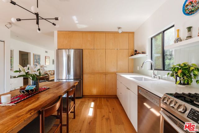 This stylishly refreshed 3-bed, 2-bath Highland Park home brings serious modern vibes with effortless indoor-outdoor flow. Bright and open, the living, dining, and kitchen areas connect effortlessly, highlighted by sleek flat-panel cabinetry, soft green tile, warm wood tones, and wide-plank floors that flood the space with light and greenery. Out back, a spacious deck opens to a private grassy yard perfect for weekend BBQs and chill evenings. A detached bonus space gives you flexibility for a home office, gym, or studio, plus a one-car garage. Just steps from York and Figueroa, you're in the heart of Highland Park near Highly Likely, Kumquat Coffee, Joy, and the Gold Line. Modern Highland Park living at its best.