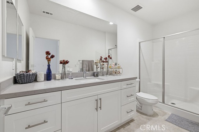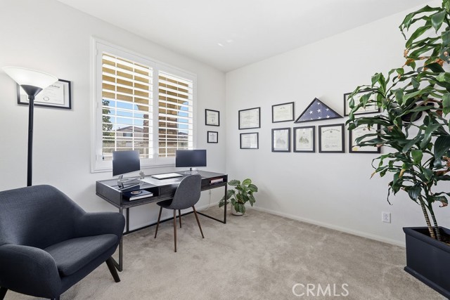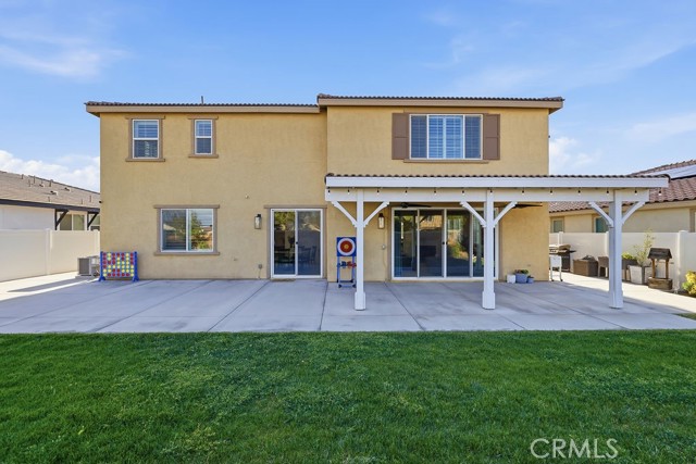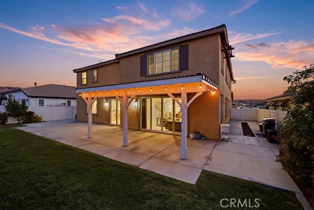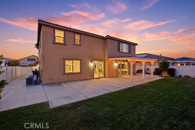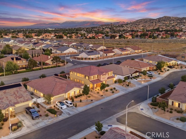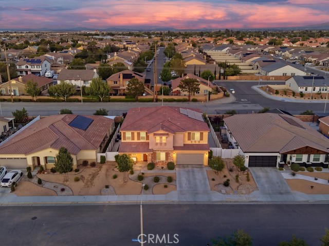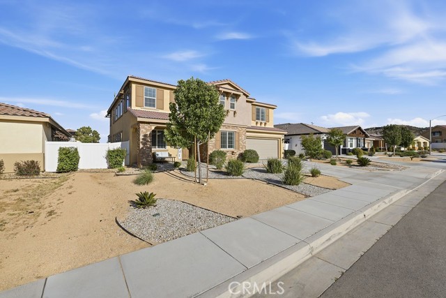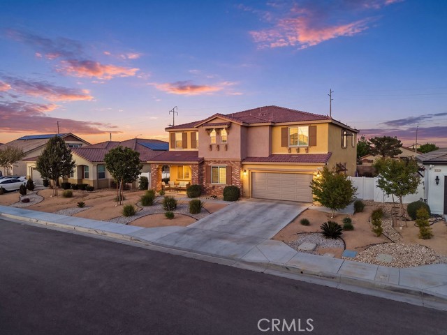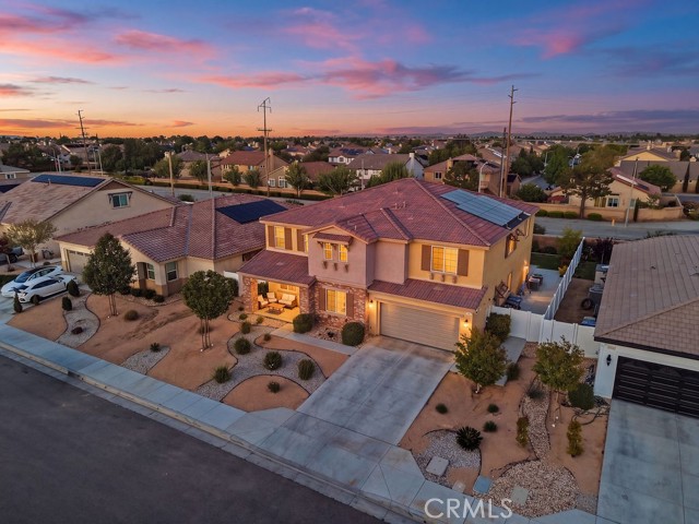 Welcome to this stunning, like new home built in 2021, ideally located in a quiet West Palmdale cul-de-sac. This spacious 5-bedroom, 4-bathroom home offers the perfect blend of comfort, functionality, and modern design. From the moment you arrive, you're greeted by a charming front porch--perfect for enjoying your morning coffee. Inside, the home is filled with natural light, complemented by large windows and shutters throughout. The open-concept layout features a spacious family room that flows seamlessly into the dining area and kitchen, making it ideal for everyday living and entertaining. The kitchen is designed for gatherings, offering a large breakfast bar, space for a dining table, stainless steel appliances, and a generous walk-in pantry with direct access to the 3car tandem garage--perfect for easy grocery unloading. Sliding glass doors provide convenient access to the backyard for indoor-outdoor living. A desirable downstairs bedroom and full bathroom offer flexibility for guests or multi-generational living. Upstairs, you'll find a spacious loft with a balcony overlooking the family room, along with generously sized secondary bedrooms. A Jack-and-Jill bathroom with dual sinks adds convenience, while the primary suite serves as a true retreat with space for a sitting area. The primary bathroom features separate sinks, a standalone soaking tub, and a separate shower. The upstairs laundry room adds to the home's functionality. Enjoy energy efficiency and long-term savings with fully paid-off solar panels--no lease or loan to assume. The front yard showcases beautiful desert landscaping, while the backyard features green grass, mature trees, shrubs, and a large concrete patio perfect for relaxing or entertaining. Located within walking distance to Highland High School, David G. Millen Intermediate, and 2 Elementary Schools, and just minutes from freeway, shopping, dining, the AV Mall, The Loop, and Marie Kerr Park. This home truly has it all, don't miss it