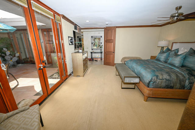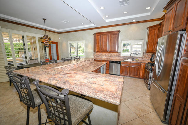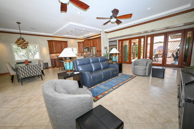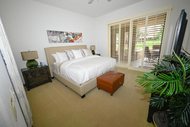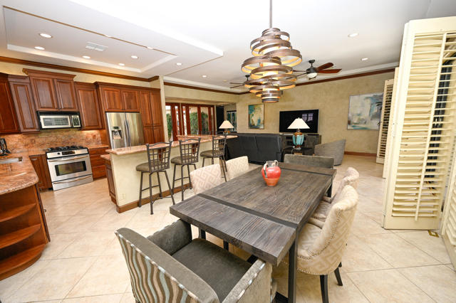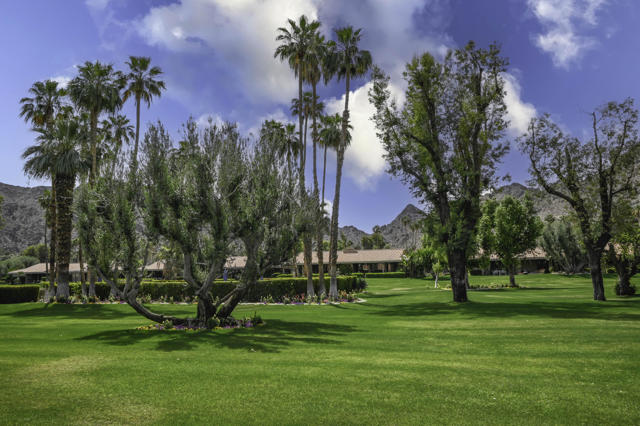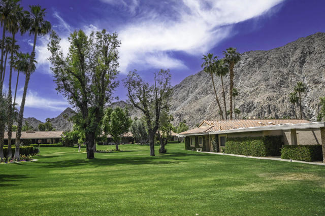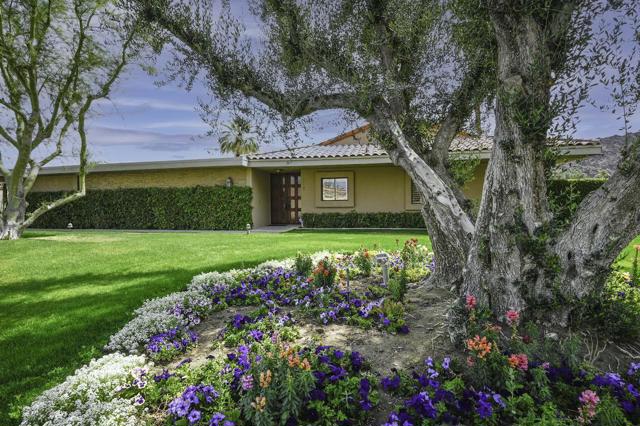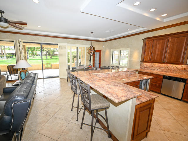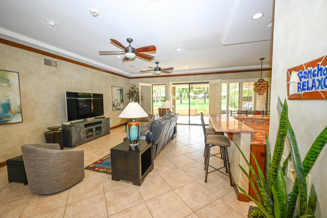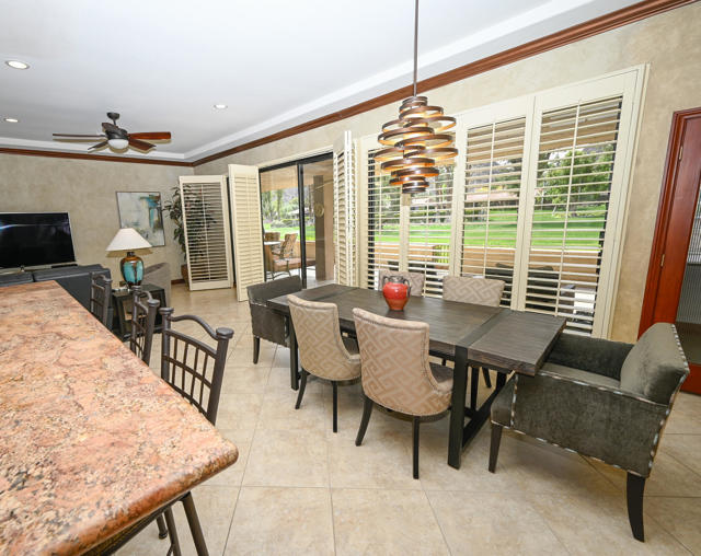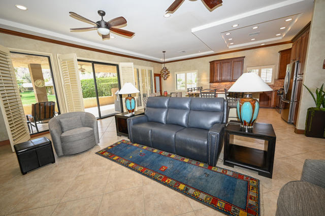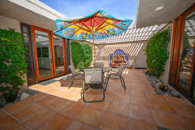 Welcome to 77745 Cherokee Road, a beautifully furnished 3-bedroom, 3-bath condominium with panoramic south mountain views, indoor atrium, & expansive greenbelt setting ideally located in Indian Wells Country Club. Offering 2,307 square feet, this inviting home blends spacious desert living, timeless finishes, and an exceptional indoor-outdoor floor plan in one of Indian Wells most desirable settings. From the moment you enter, the home impresses with its open layout, neutral ceramic tile flooring throughout most of the residence, and rich architectural details including plantation shutters, walnut crown molding, & walnut baseboards throughout. The bedrooms are generously sized, with carpeting in the primary suite and one guest bedroom for added comfort. A standout feature of the home is the large indoor atrium finished in Saltillo tile, creating a stunning private space for relaxing, entertaining, or simply enjoying the beauty of the desert surroundings. The primary bedroom, one guest bedroom, and the great room all open to the atrium through beautiful glass French doors with rich wood trim, giving the home a warm and distinctive character. The primary suite offers a wonderful private retreat, complete with a large walk-in shower with glass block, dual sinks, granite countertops, & a spacious walk-in closet with custom drawers and shelving. Each bedroom features its own ensuite bath & large walk-in closet, offering comfort and privacy for both owners & guests. The open chef's kitchen is designed for everyday living and entertaining, featuring granite countertops, bar seating, a built-in wine cooler, and stainless steel appliances. From the kitchen & the formal dining room, the views are truly outstanding, with sweeping panoramic mountain vistas enhancing the entire living experience. One guest bedroom enjoys beautiful mountain views, a walk-in tiled shower, and granite countertops. The second guest bedroom is currently used as a home office, featuring a rich built-in wood desk, extensive bookshelves, a stand-alone sink, and a large walk-in closet, making it as functional as it is flexible. Additional highlights include a laundry room with washer and dryer and abundant storage, plus a two-car plus golf cart garage with epoxy flooring and numerous built-ins. Outside, the extended south-facing rear patio overlooks a large greenbelt, with the community pool & spa beautifully set with lush landscaping, all framed by incredible panoramic south mountain views.