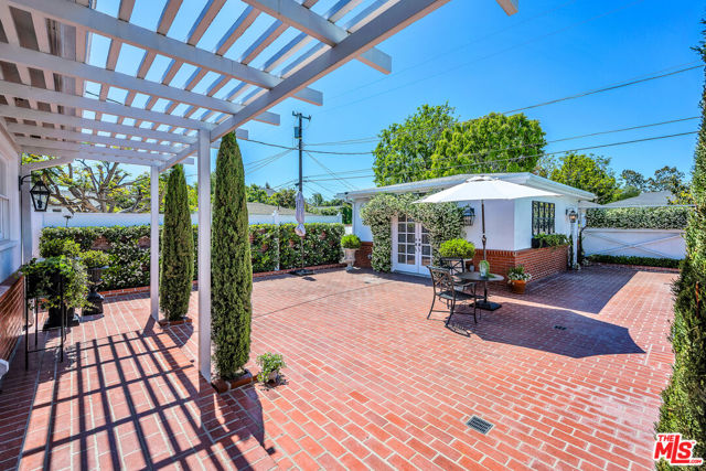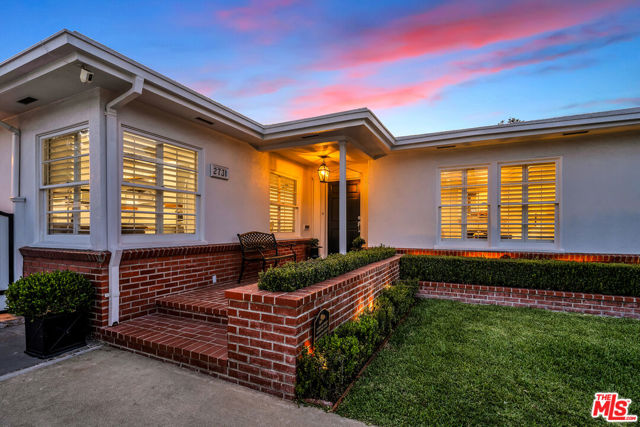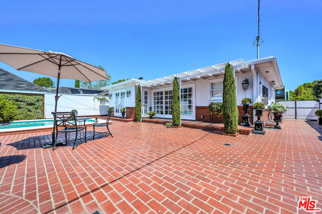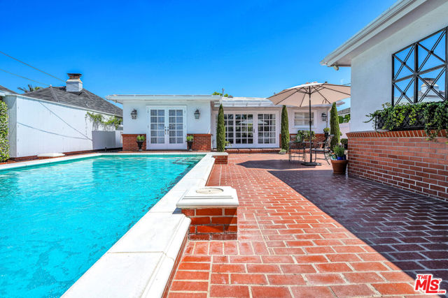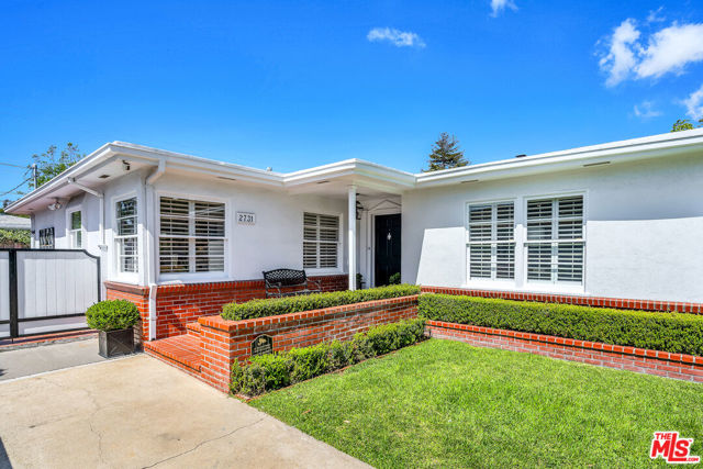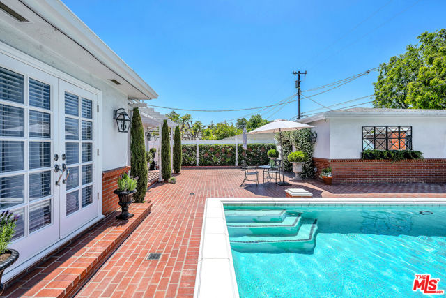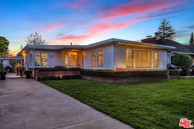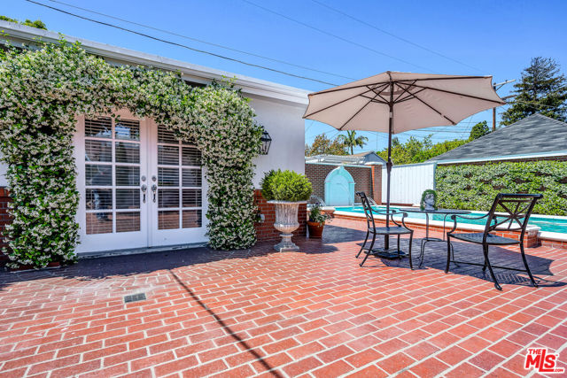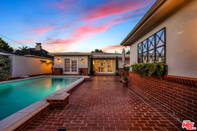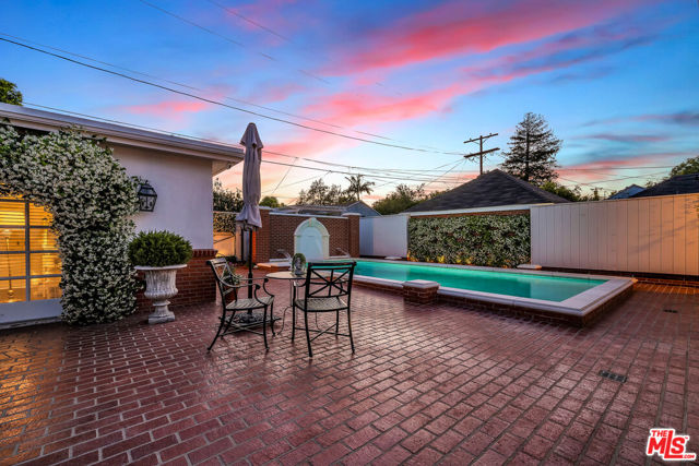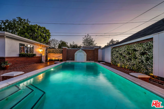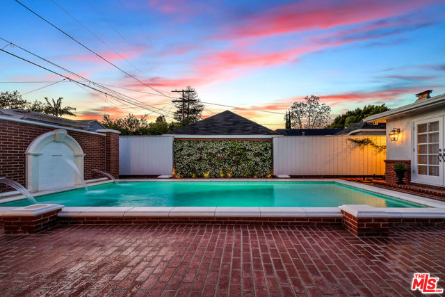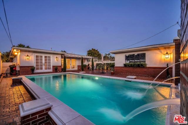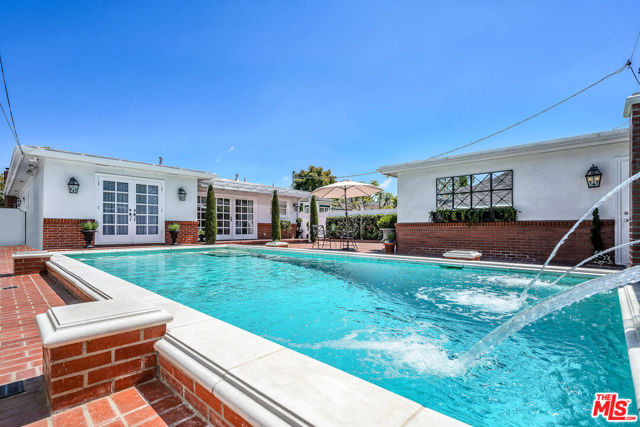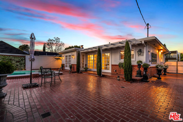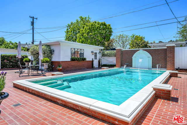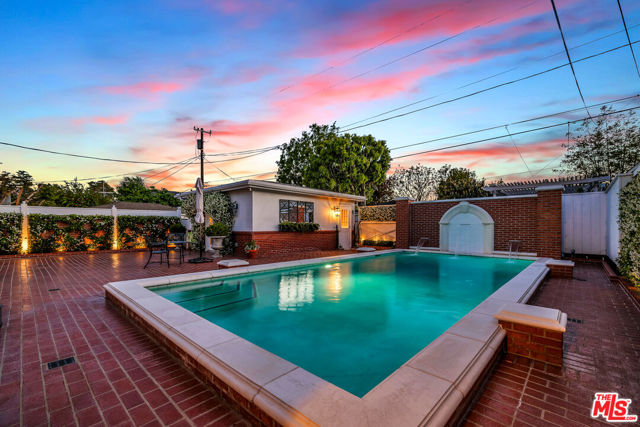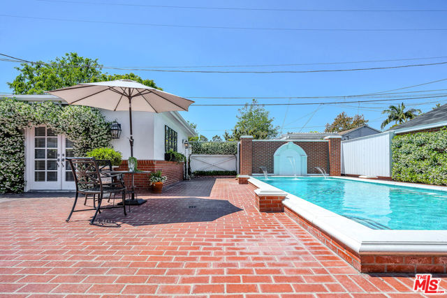 This two bedroom two bath beauty is flooded with light and offers perfect indoor/outdoor living. The spacious living room, overlooking the front yard, has a fireplace and white oak floors. Matching white oak flooring flows throughout, leading to a generous dining room and open den, ideal for large dinner parties! Both spa-inspired bathrooms have been tastefully remodeled with Perrin & Rowe fixtures and elegant Italian porcelain tile. One features a luxurious soaking spa tub, while the other offers an oversized shower with built-in seating. The kitchen features a six burner gas cooktop and ample storage. Additional highlights include central air conditioning and built-in Bose speakers.Step outside the den into a serene backyard oasis with a brick patio, sparkling swimmer's pool, and tranquil fountain ideal for relaxing or hosting guests. The garage, enhanced with French doors, has been transformed into a versatile bonus space, complete with a laundry area and extra storage. Situated in a prime central Westside location, this home is just moments from popular dining, Trader Joe's, The Expo Line, major freeways, UCLA, and Century City. Located within the sought-after Clover Avenue School District, this is a rare opportunity not to be missed!