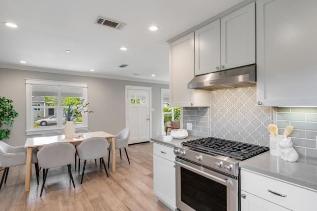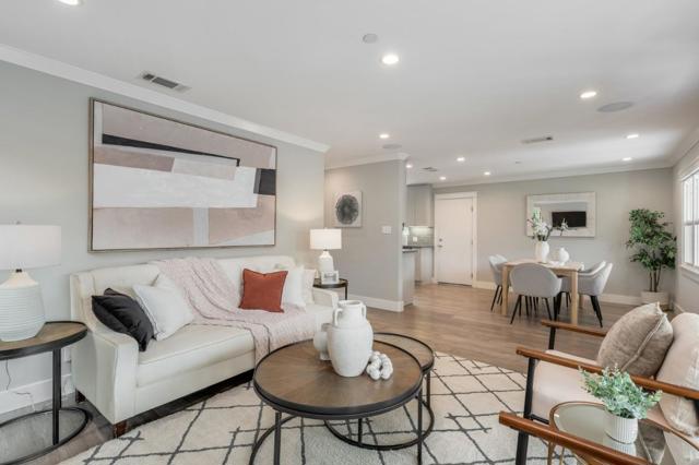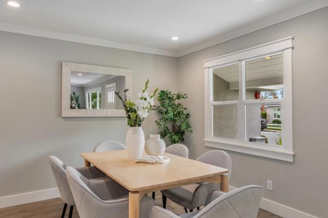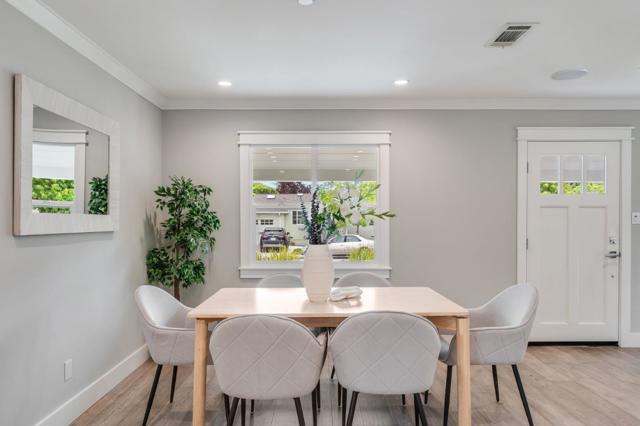 Where form, function, scale, and light seamlessly coexist, this completely renovated and expanded 4BR/2BA showpiece in San Mateo Village offers a transformative living experience. Elegantly composed and spanning approximately 1,536 SF, the refined floor plan is elevated by wide plank flooring, crown moldings, premium millwork, contemporary fixtures, and a designer color palette. The spacious living room flows effortlessly into the dining area and ideally positioned kitchen, beautifully appointed with quartz countertops, shaker cabinetry, a gas range, and stainless-steel appliances. Privately situated, the magnificent primary suite is distinguished by a soaring cathedral open-beam ceiling, direct access to the rear deck, a walk-in closet, and a sumptuous bath featuring a skylight, dual vanities, and an impressive, oversized shower. Three additional bedrooms, a full bath, a laundry room, and an attached one-car garage complete the interior. Outside, an inviting lounging terrace transitions seamlessly to a pergola-covered dining pavilion with integrated heaters, a built-in barbecue, and an artisan pizza oven, creating an exceptional setting for year-round outdoor enjoyment. A sizable lawn, expansive paved side yard, and storage shed further enhance the thoughtfully designed grounds.