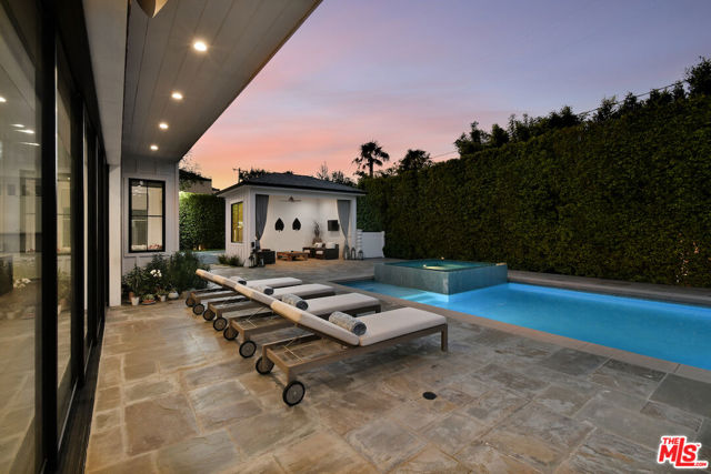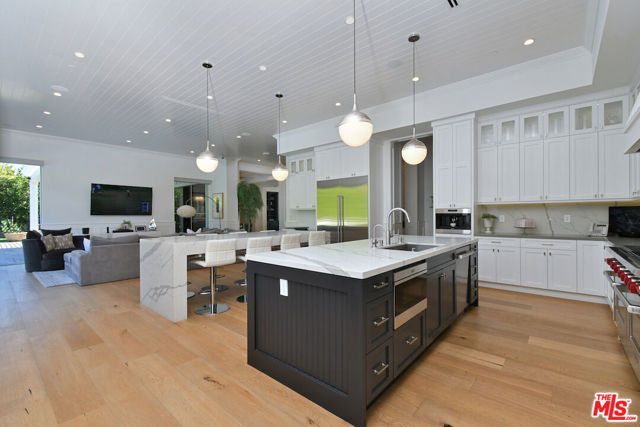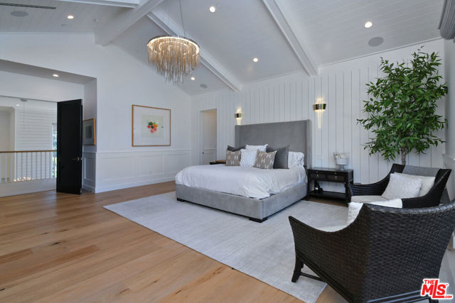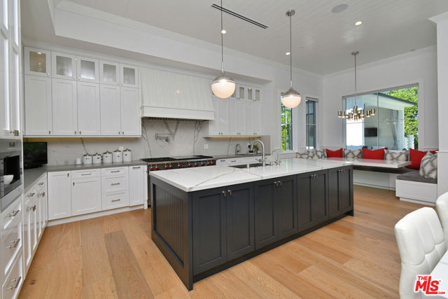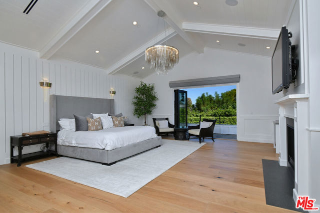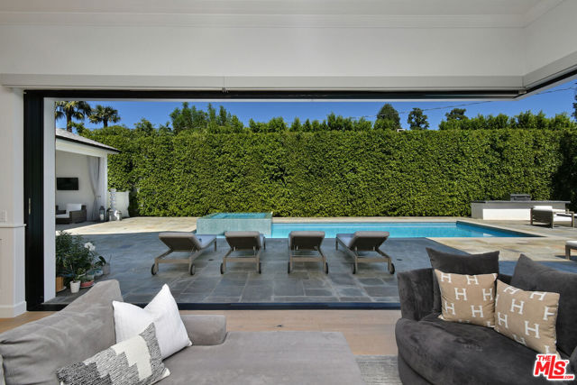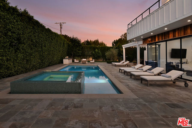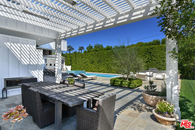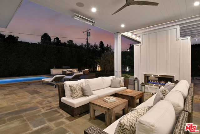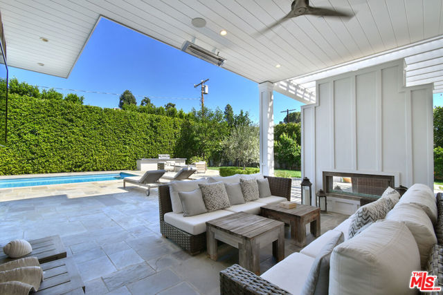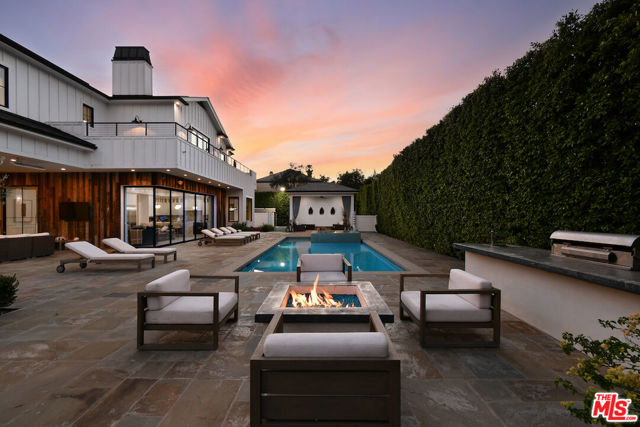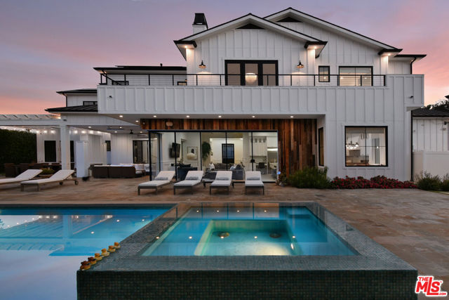 Experience refined modern farmhouse living in the highly coveted Amestoy Estates. Situated on an expansive 18,000+ sq ft corner lot at the end of a prime cul-de-sac, this gated estate showcases exceptional curb appeal and thoughtful design throughout.A bright, open-concept floor plan is enhanced by oversized windows that flood the home with natural light, while custom built-ins add sophistication to the formal living and dining spaces. A striking wine room is perfectly positioned for both function and display.The gourmet kitchen is designed for both everyday living and entertaining, featuring top-of-the-line Wolf appliances, dual oversized quartz islands, a butler's pantry, and abundant storage.Seamless indoor-outdoor flow is achieved through floor-to-ceiling pocket sliding doors, opening to a true entertainer's backyard complete with a Pennsylvania bluestone patio, resort-style pool, zero-edge spa, outdoor living room with a double-sided fireplace, pavilion, sports court, BBQ area, fire pit, and a generous grassy lawn. The luxurious primary suite offers vaulted beamed ceilings, a fireplace, and a wraparound balcony with tranquil treetop views. Upstairs includes three additional spacious bedrooms, a built-in workstation, and a dedicated laundry room. Downstairs features a guest bedroom, private office, and a plush home theater with a state-of-the-art sound system. Additional highlights include a Control4 smart home system and a gated motor court with ample parking. Ideally located near Encino's premier shopping, dining, and lifestyle amenities, this home offers the perfect blend of luxury and convenience.