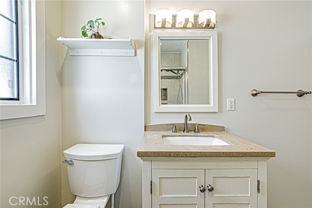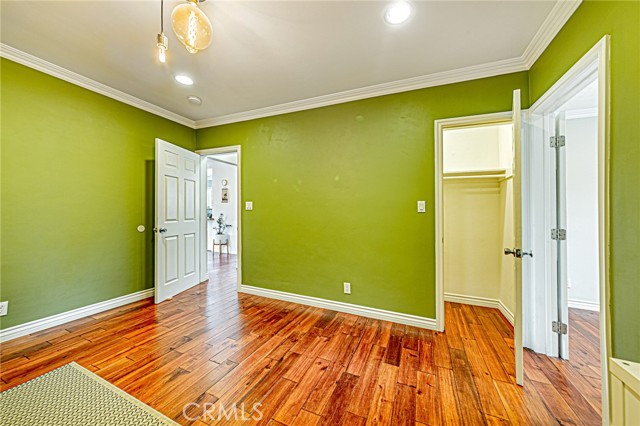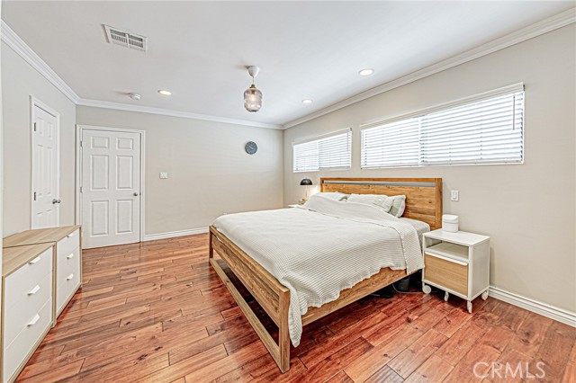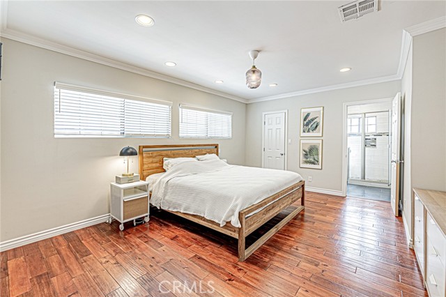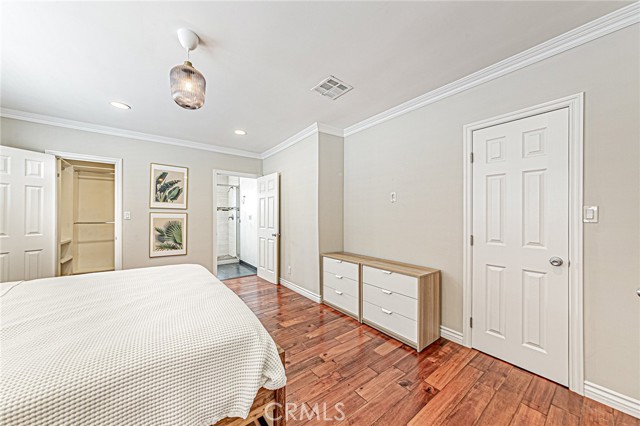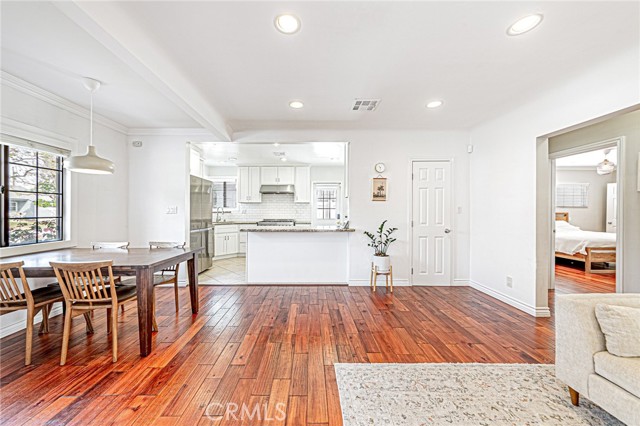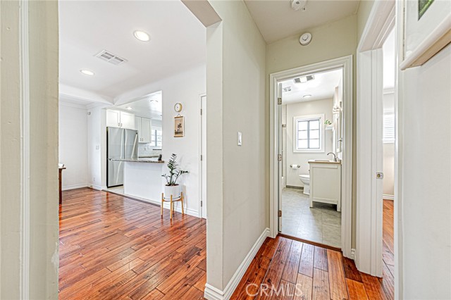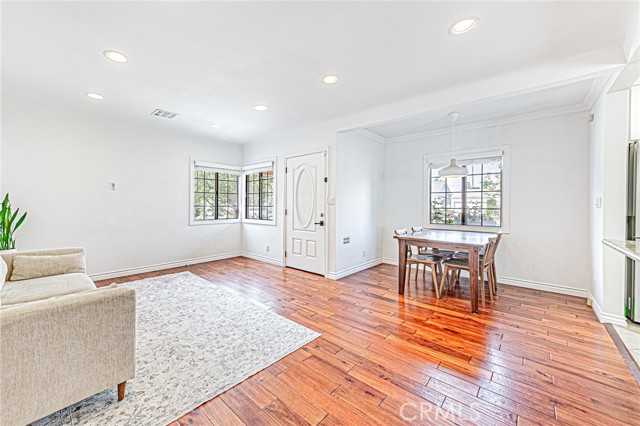Additional features include hardwood flooring throughout, recessed lighting, double-pane windows, and a recently installed NEW ROOF. The spacious primary suite offers a walk-in closet with custom organizers and a beautifully updated bathroom with designer tile and fixtures.