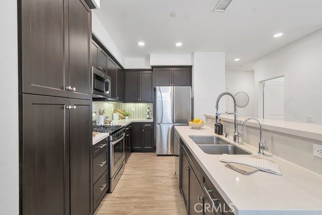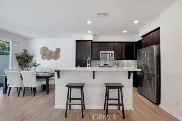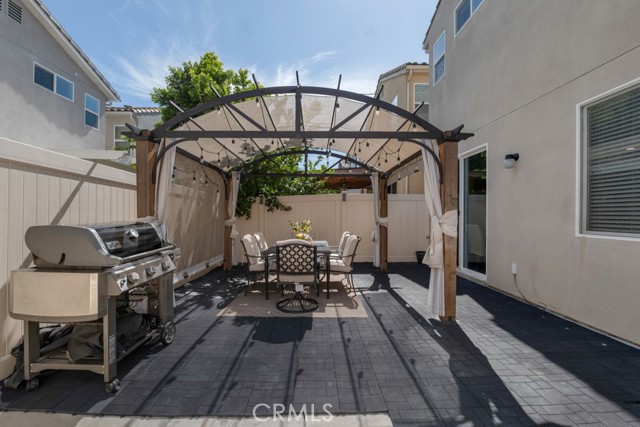 The kitchen features quartz countertops, stainless steel appliances, and a breakfast bar that opens to the dining area, perfect for everyday living and entertaining. Sliding doors lead to a private courtyard with a gazebo, ideal for outdoor dining and summer BBQs.