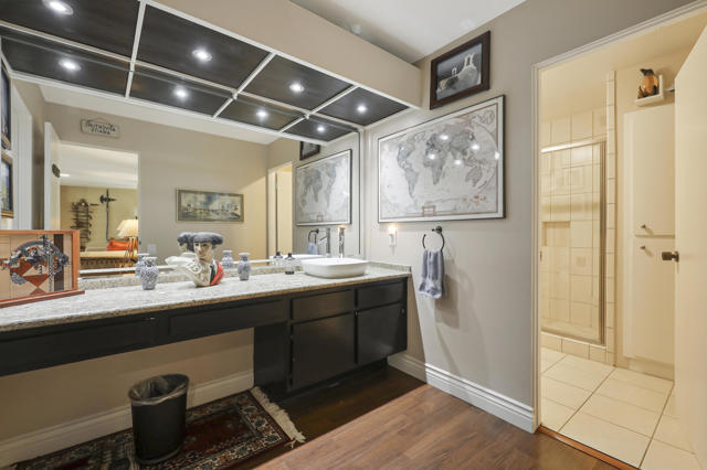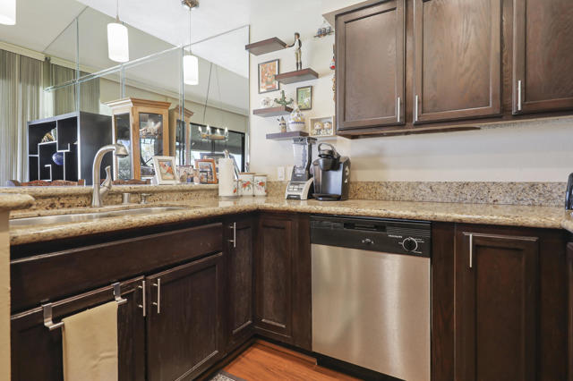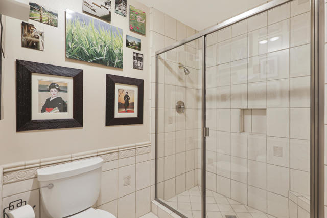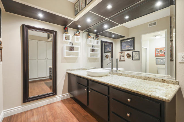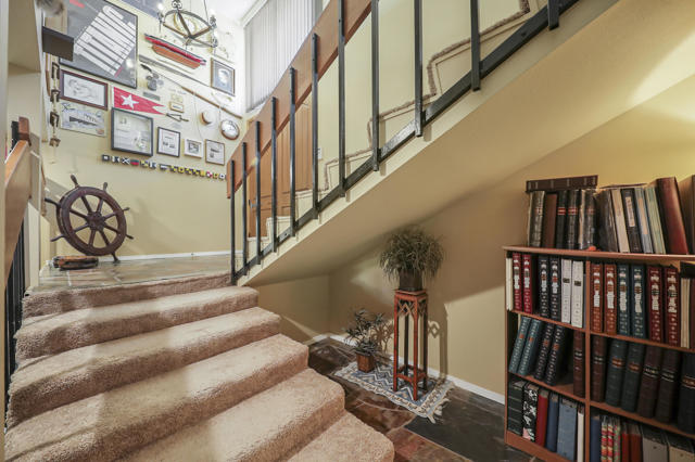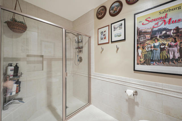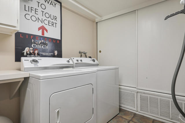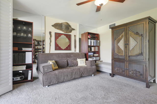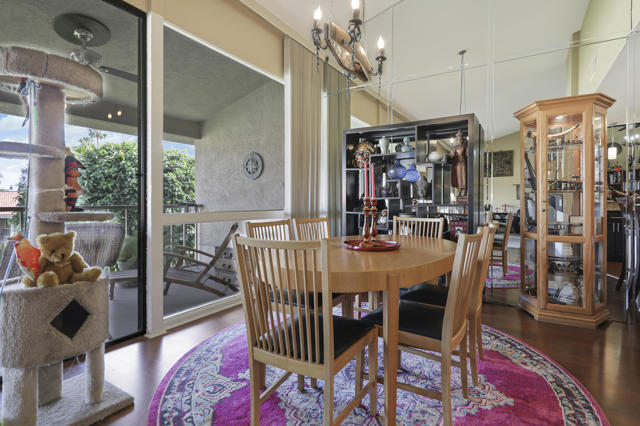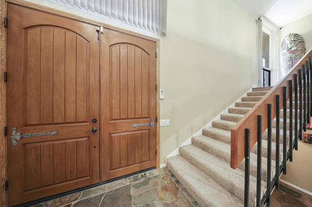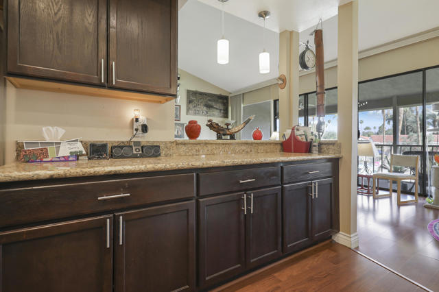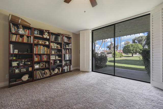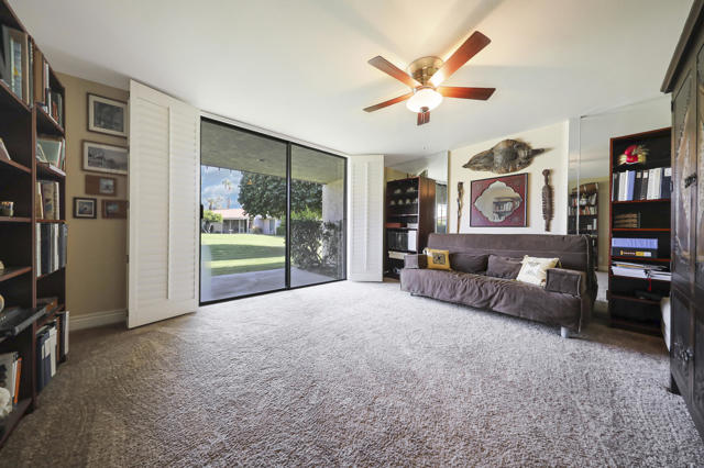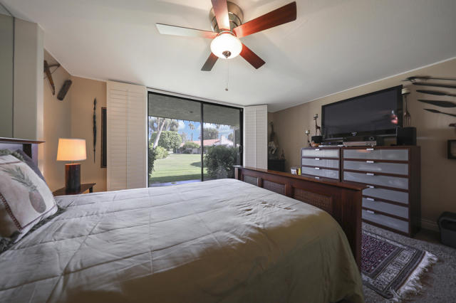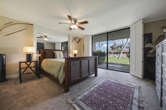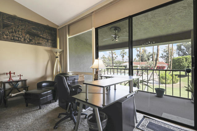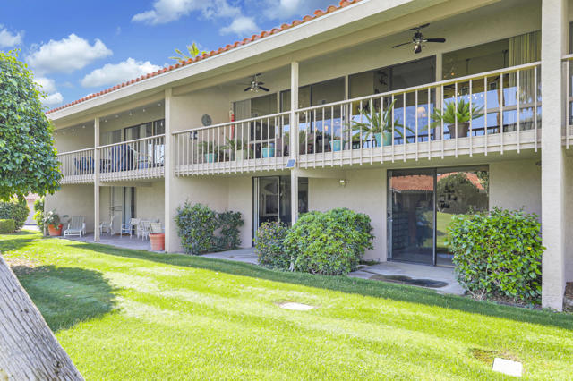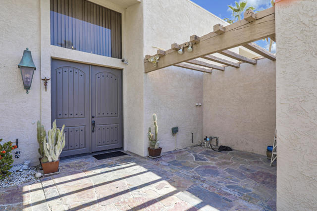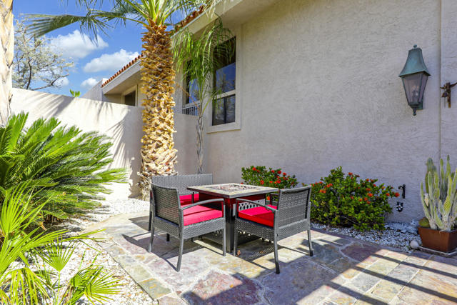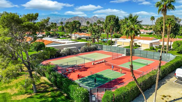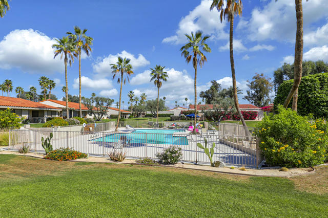 Unique opportunity to own a very special, spacious 2,608 Sq.Ft., split level condominium with 14 ft. soaring ceilings in the Great Room and entry, located in the beautiful enclave of Montego West within the Bermuda Dunes Country Club. Your own private and quiet desert oasis features a pool just steps from the back, and tennis and pickle ball courts steps from the front! Gaze out at the pool, mountains and green belt from your Texas-sized 32' by 8' balcony and then relax in the spectacular great room with panoramic views from your 12' sliding windows. The chef's kitchen with stainless steel appliances and slab granite counters opens up to the living/dining areas and is an entertainers dream. There is a convenient pantry off the kitchen, as well as a full bathroom. Downstairs are TWO large primary en-suite bedrooms each with a walk-in closet, which open up to private covered patios and are just steps from the pool. A large laundry room and also a storage room are downstairs. Enter the gates of your home through a professionally landscaped courtyard with slate tile - an ideal and serene place to relax and reflect. Slate tile is also featured in the entry and downstairs which lends a touch of elegance. If you are an art collector who wants your own private gallery or want to feature your impressive library, this home is for you!! The incredible amount of wall space and soaring ceilings are unparalleled. The owner is downsizing and is willing to sell some furniture, lighting fixtures and antiques from their world travels. There is an attached golf cart garage, and a one-car detached garage. The low HOA includes pools (7), landscaping, trash, water, fire & liability insurance and roofs. Security HOA covers cable TV, Spectrum internet and 24-hour security. You will feel like you're living in your own private sanctuary in this exquisite and impressive home.