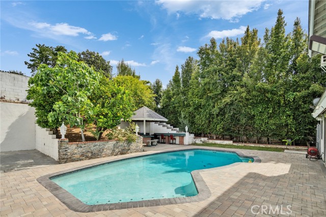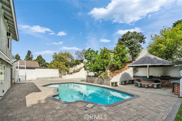 Step outside to your private pool oasis — surrounded by beautifully landscaped grounds featuring new pavers around the pool area, a stylish covered patio deck with glass walls, and clean concrete side yards. The expansive backyard is an entertainer's dream, complete with a large gazebo, built-in BBQ grill, stove, and entertainment table — everything you need to host in style. The lush yard is also home to a wonderful variety of fruit trees including lemon, orange, avocado, loquat, pomegranate, and more — a true garden paradise.