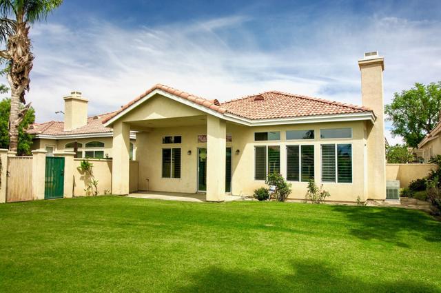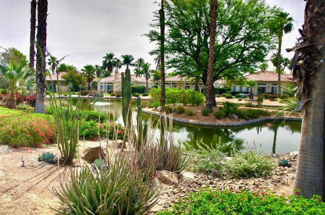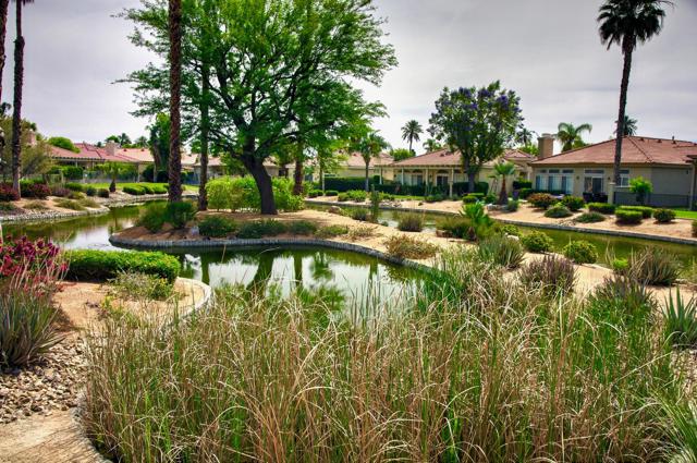 An immaculate 3 B/R, 2Bath home in the desirable Indian Palms Country Club. This home has a spacious great room, kitchen and dining area with an open floorplan. The many windows allow for a sunny room. It opens up to a serene view of ponds, streams and lovely greenery. There is a private courtyard between the living room and main bedroom. Additionally, there are wooden shutters throughout the home and stereo speakers in the ceilings of the great room and primary bedroom. The junior suite has a flex area that can be used as a retreat, office or craft room, or an extra sleeping area. Indian Palms has a 27-hole public golf course and a Lifestyle Center that offers a gym, large pool, tennis courts, bocce ball and pickle ball. Indian Palms is located near the famous Coachella and Stagecoach music festivals. This is a must-see home. Original sale price was a typo. It should have been 555.00.