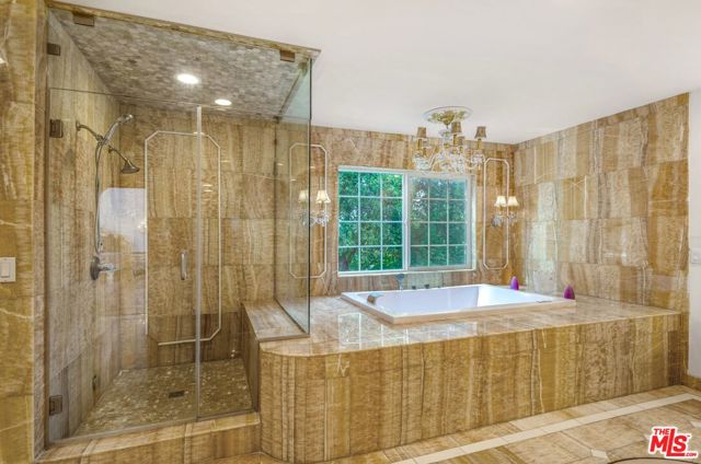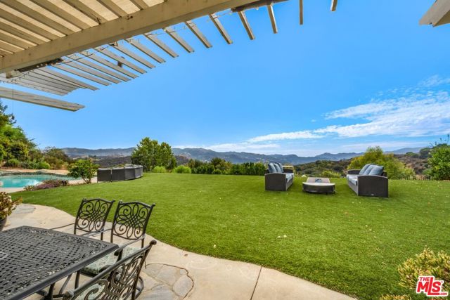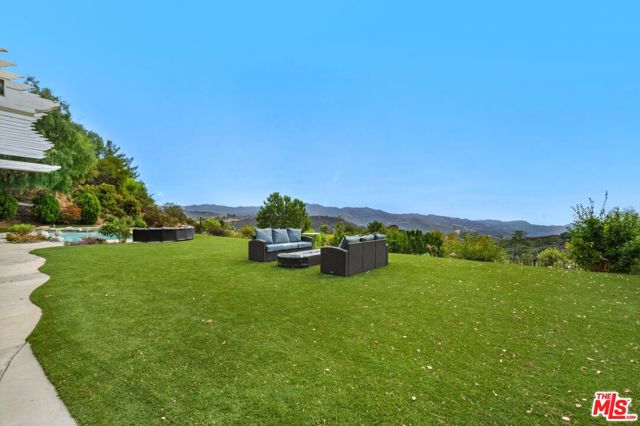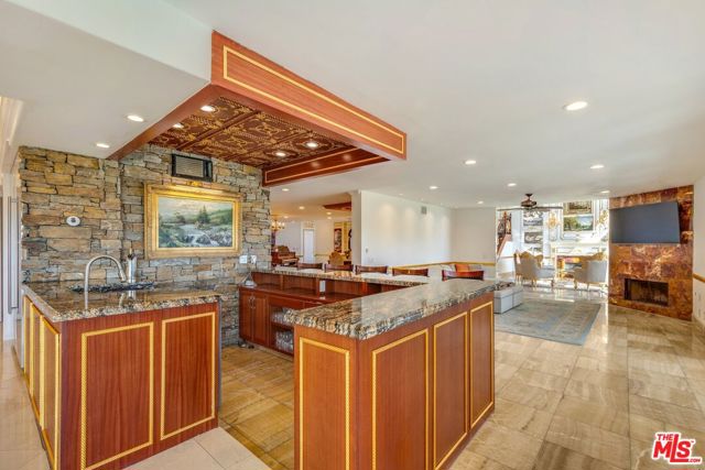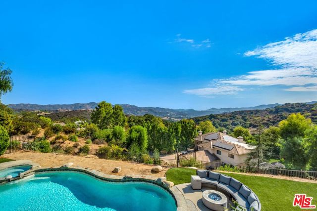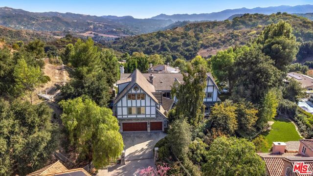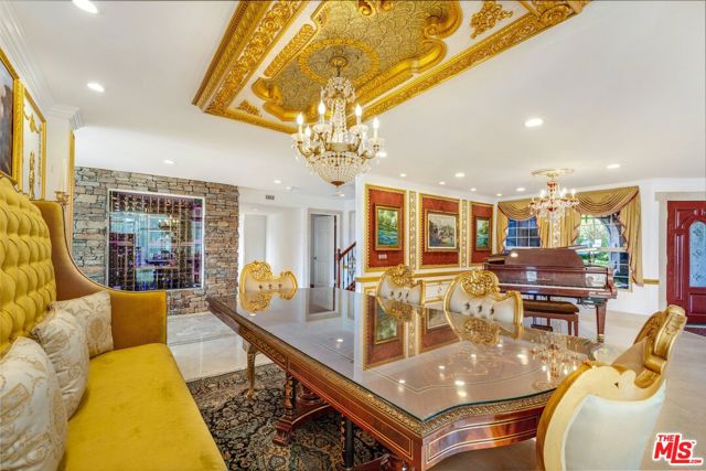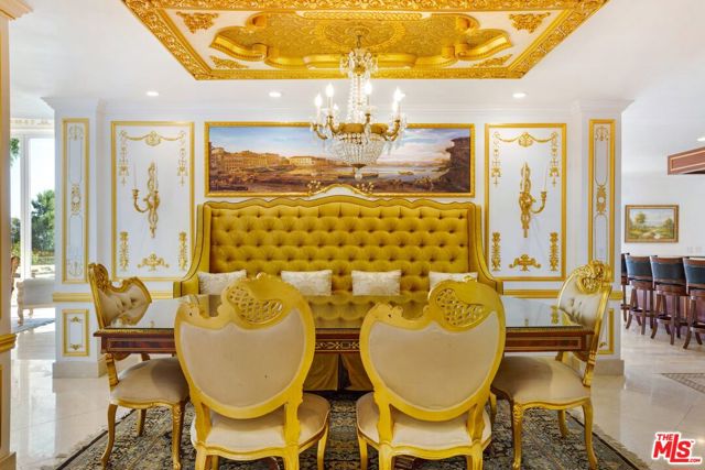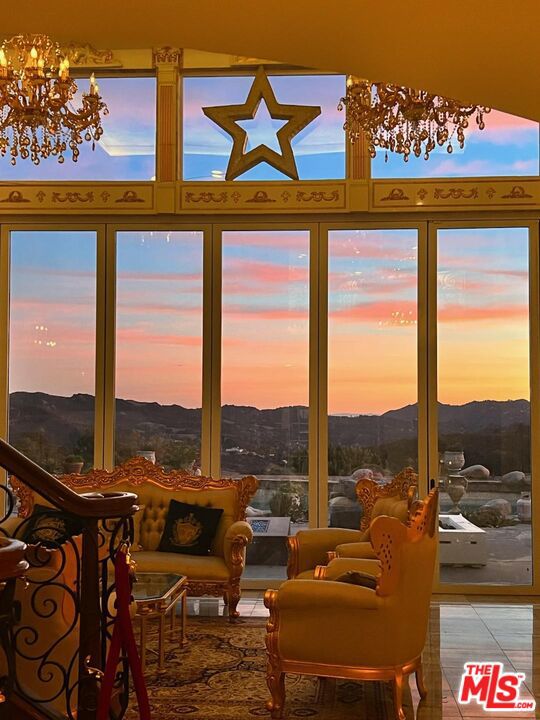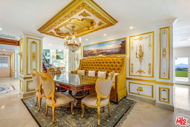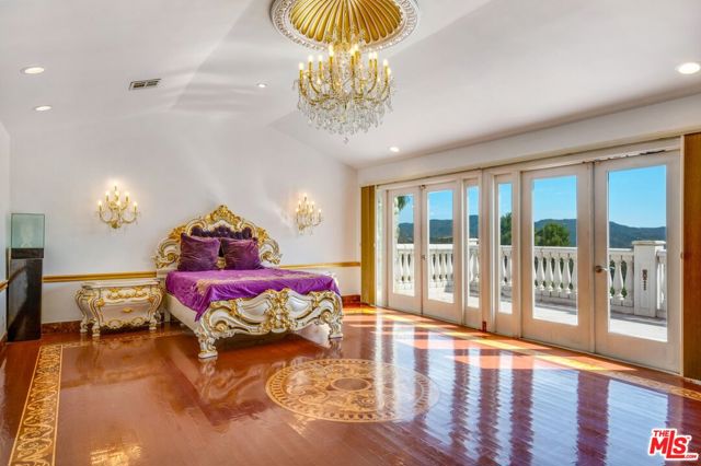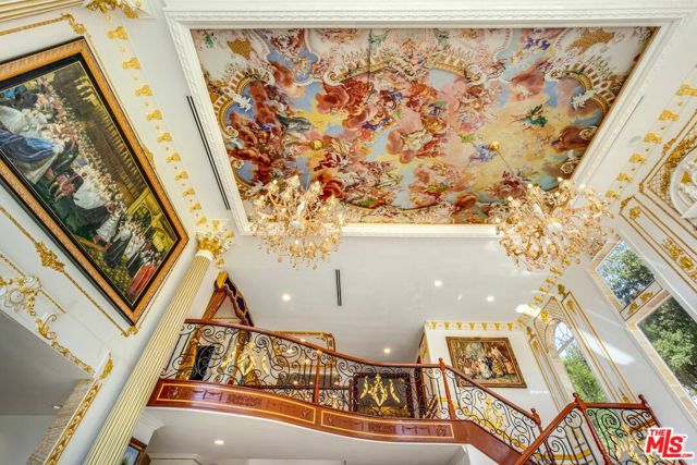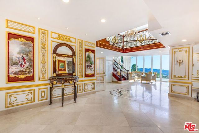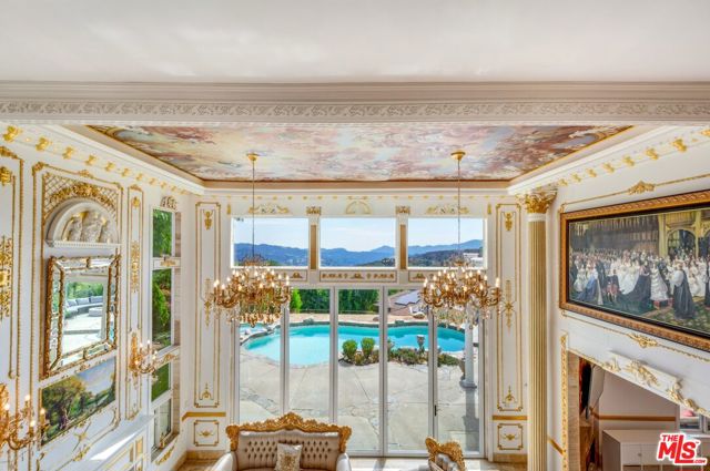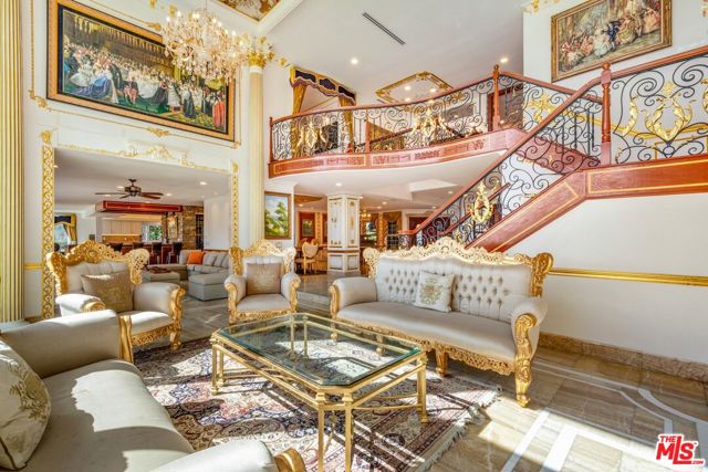 Welcome to Versailles Topanga, a stunning storybook jewel offering panoramic canyon and mountain views, with even distant glimpses of Catalina Island. Nestled on the largest lot at the end of a cul-de-sac, this home ensures complete and gated privacy. Designed and executed in period-authentic 18th Century French Rococo, this masterpiece features custom panels throughout the house designed by Rococo artists and hand-gilded in 23.75 karat gold-leaf, using techniques and materials true to the Rococo Era. Custom-commissioned artwork from the period is embedded throughout the home, adding to its historical charm. The wrought iron balusters, designed and gilded onsite, are modeled after those in the French Embassy, adding a touch of regal elegance. The lower level boasts custom marble medallions, double inlaid Onyx floors, and commercial-grade large format Crema Marfil (Spain) Marble and Marble Baseboard. The magnificent living room boasts soaring, high ceilings in luxurious, walls of floor to ceiling glass and windows framed with Onyx marble casings and Greek Thasos Marble Trim, creating a grand and luxurious ambiance. The open floorplan concept offers a panoramic view of the interior living areas from the grand entry foyer to the opulent living room, the royal formal dining designed with custom built furniture, to the casual family room with romantic fireplace, opening up to a dream granite kitchen with island, new double subzero, two ovens, two stove cooktops, garden window and more panoramic views! There is a large guest bedroom suite on the main level, powder room and laundry room. The elegant wrought iron gold-leaf staircase leads to the upper level, all bedrooms feature double 1" maple borders manufactured in-house around real oak flooring, with custom archways designed to highlight your art collection. The luxurious primary retreat, sitting room and office showcase intricate wooden inlaid floors with borders and Pakistani Red Onyx Marble Baseboard. The primary spa-like bathroom is a haven of relaxation, with book-matched honey onyx up the spa tub, marble borders and inlays made in-house, a steam shower, jet tub, the huge primary suite offers a sitting room, panoramic views, a huge deck, and two large walk-in custom closets. This home also includes a huge home theater, art and music studio, one thousand bottle, temperature-controlled custom wine cellar. You will be blown away by the unobstructed views from almost every room. Extra-large and flat back yard with entertaining pool and spa, a huge built-in BBQ, and manicured lawns with a gazebo make this an entertainer's paradise. No detail was spared in the design of this home. Unique and totally magical, Versailles Topanga is a masterpiece like no other. Nothing else compares!