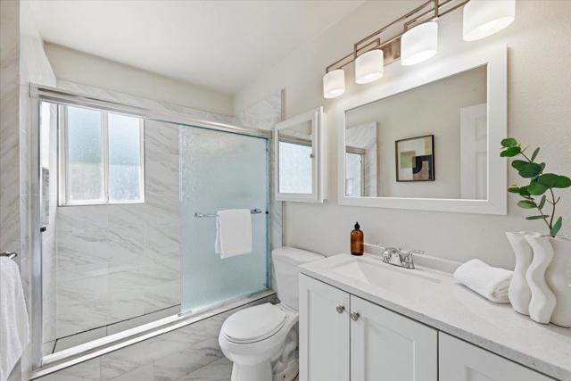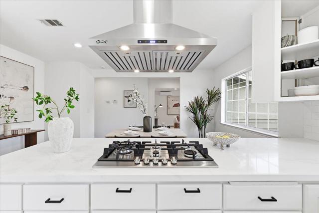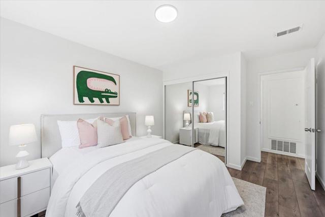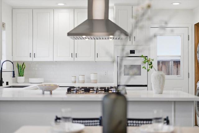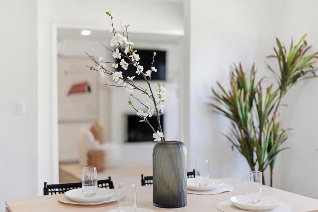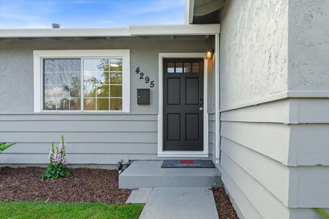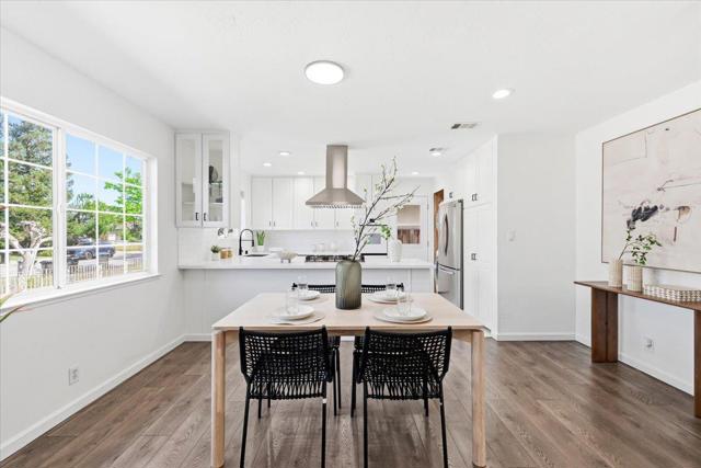 Modern design, move-in ready, and a detached garage with excellent ADU potential (buyer to verify) make this beautifully upgraded home a standout opportunity. Bright and open, the living and dining area features luxury waterproof flooring, large picture windows, a sleek fireplace, and new recessed LED lighting. The gourmet kitchen is fully refreshed with white cabinetry, matte black hardware, brand new quartz countertops, stainless-steel sink with designer faucet, brand new gas range, and brand new vent hood, double ovens, Samsung® refrigerator. A breakfast bar, pantry storage, and direct side yard access add functionality and flow. The spacious primary suite offers dual closets, new LED lighting, and an updated bath with modern vanity, marble-inspired tile, and a sleek shower. Two guest bedrooms are bright and comfortable, including one with French doors to the backyard. The renovated guest bath features porcelain tile and modern finishes. Enjoy a private backyard with mature trees, fruit trees, and ample space for entertaining. Ideally located just a short walk to Oster Elementary and Butcher Park, offering easy access to playgrounds, sports courts, a dog park, and open green space. Easy commute to major tech hubs. Welcome home!