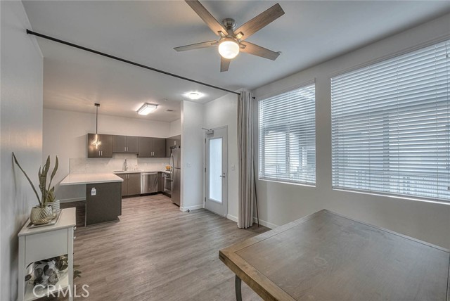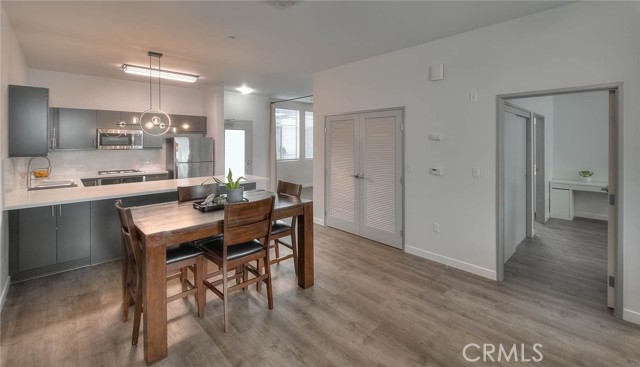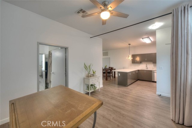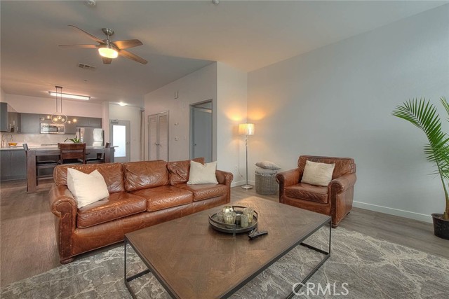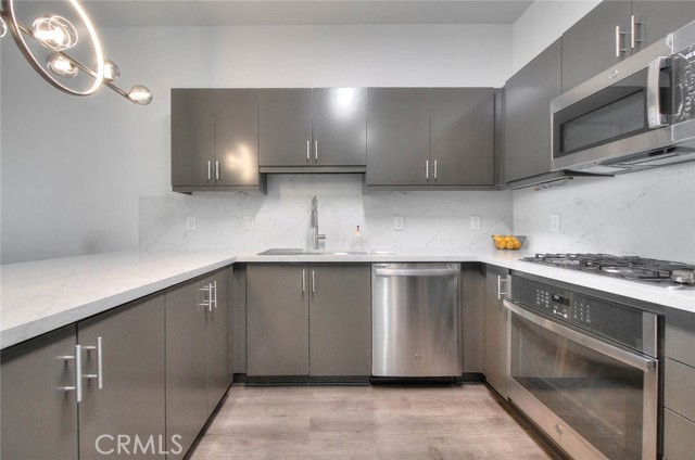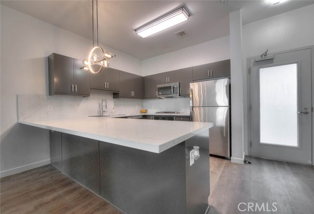 This modern remodeled property offers a stylish 3-bedroom, 2-full-bathroom condominium located mere minutes from Disneyland. Key features include high ceilings and striking neutral flooring throughout, a beautiful kitchen boasting ample cabinetry, stainless steel appliances, quartz countertops, and a huge breakfast bar area. The open-concept kitchen, dining area, and living room provide an ideal floor plan for both entertainment and relaxation. The expansive master bedroom features an en-suite full bathroom and a spacious walk-in closet, complemented by an additional closet. The second bedroom is roomy and includes its own full bathroom. The third bedroom currently serves as a functional workspace, offering the potential for a home office. Residents of the complex enjoy access to a picturesque courtyard area complete with a pool, jacuzzi, BBQ facilities, and seating areas. Tastefully renovated, this property is move-in ready. Experience the best of urban living in downtown Anaheim, steps from an array of amenities including restaurants, bars, breweries, bakeries, coffee shops, and boutiques, with the lively Packing district less than a mile away.
