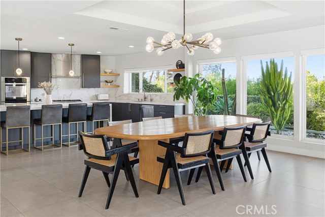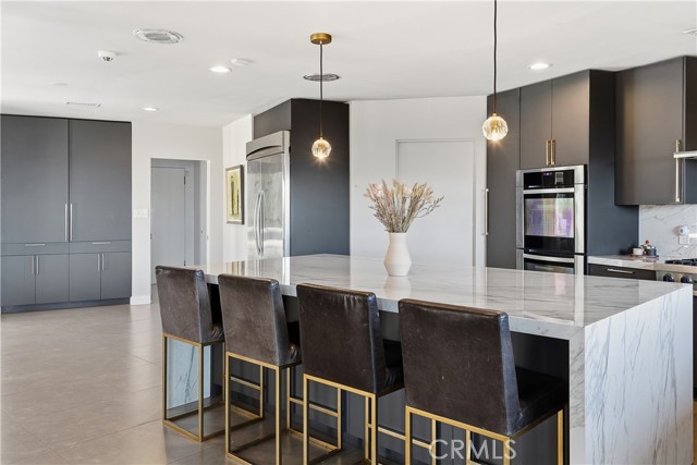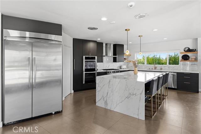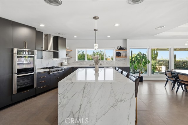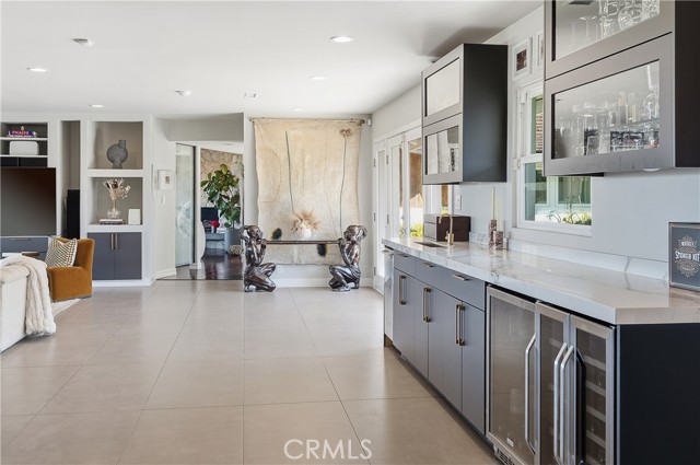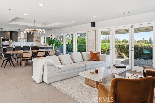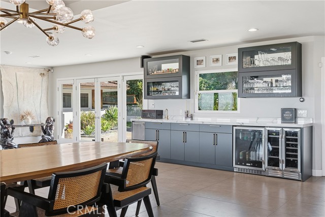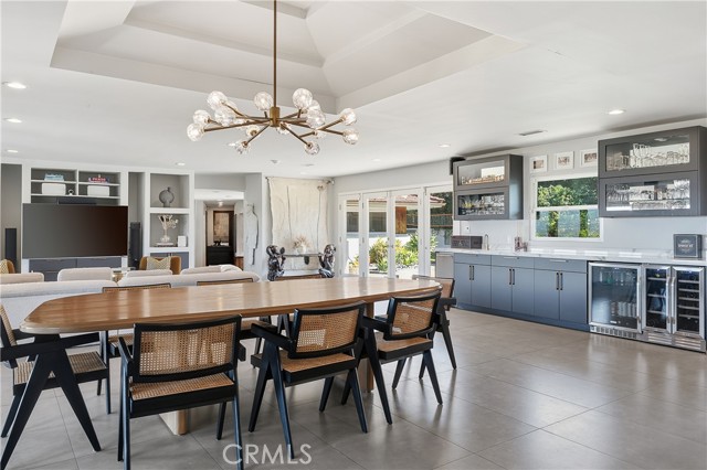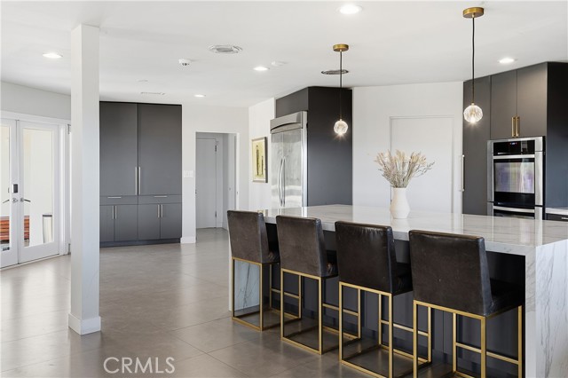 Walls of glass and French doors wrap the home, flooding the interiors with natural light while creating a seamless connection to the courtyard and surrounding outdoor spaces, with pass-through windows connecting to an interior bar and enhancing the indoor-outdoor flow. The open-concept layout features a modern chef’s kitchen with a waterfall-edge island, custom cabinetry, and top-tier stainless steel appliances, leading into the expansive living and dining areas designed for entertaining.