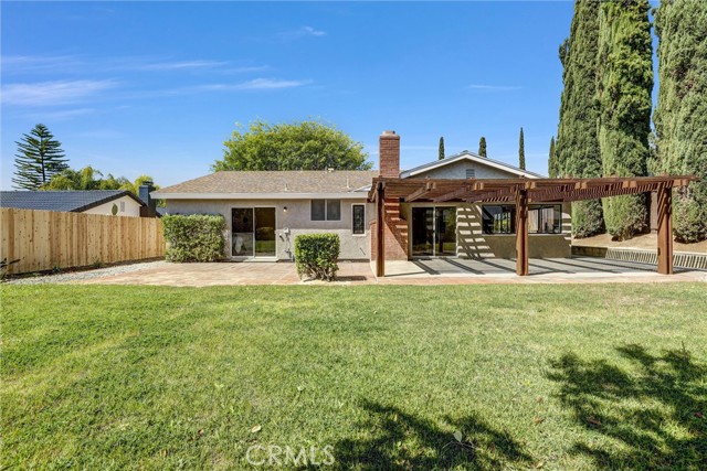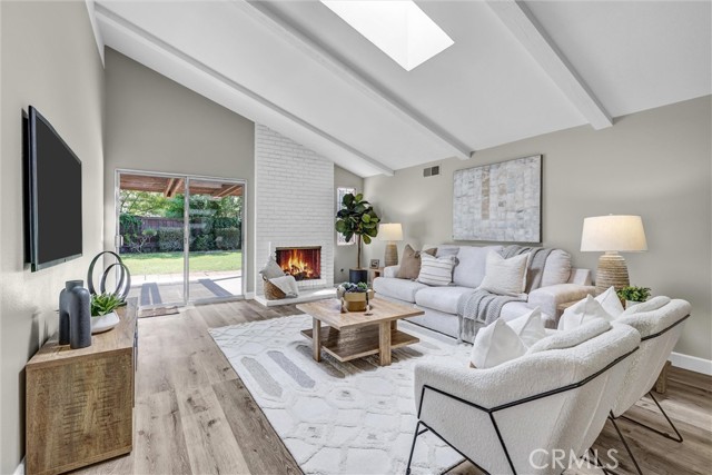 Step into a remodeled kitchen that opens seamlessly to the dining area, featuring stainless steel appliances, granite countertops, and a large window overlooking the expansive backyard with mature orange tree—perfect for everyday living and entertaining. The inviting living room boasts a cozy fireplace and skylight, filling the space with natural light and warmth.