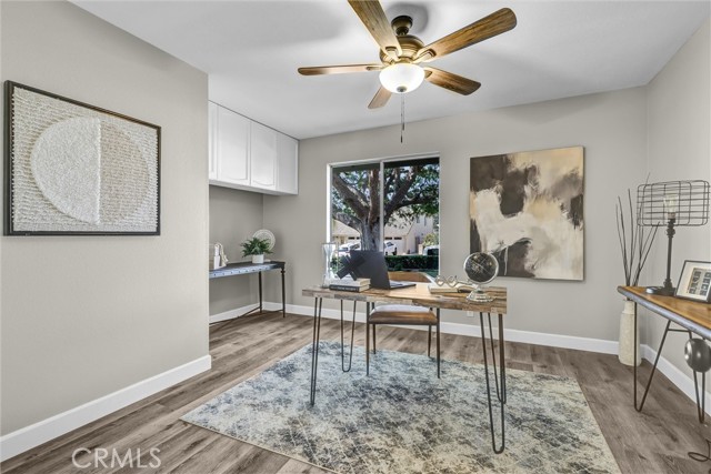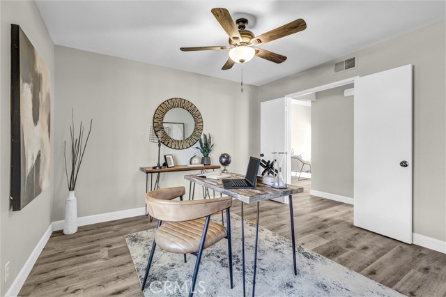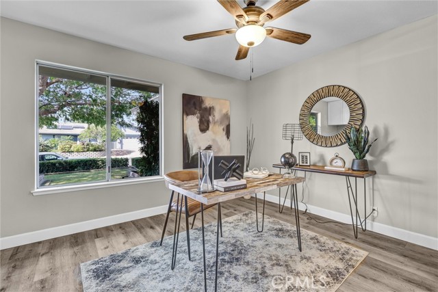 The generously sized primary suite offers a private retreat with a dedicated changing area, en-suite bathroom, and direct access to the backyard through a sliding glass door. The fourth bedroom is currently configured as a large office (permitted as a bedroom), providing flexibility for today’s lifestyle needs.