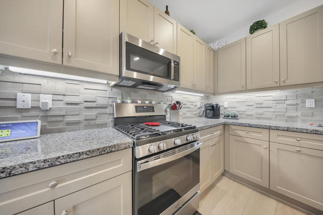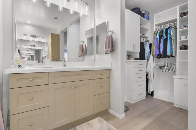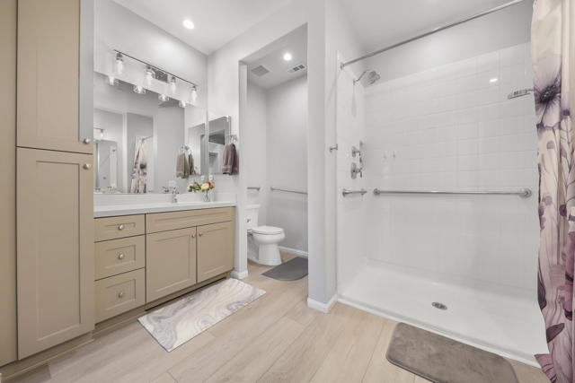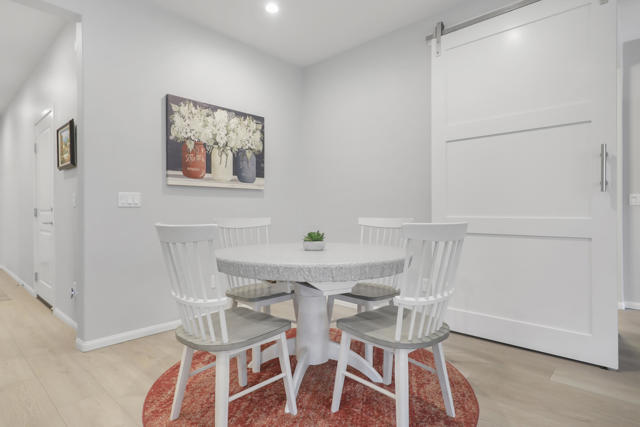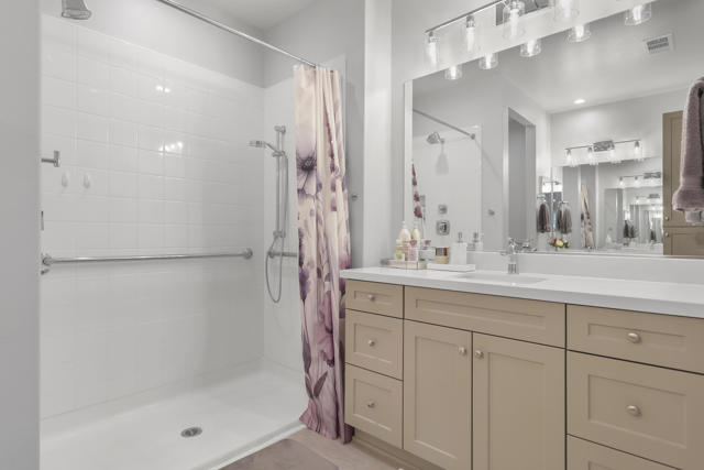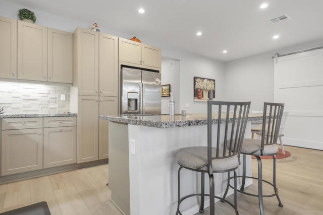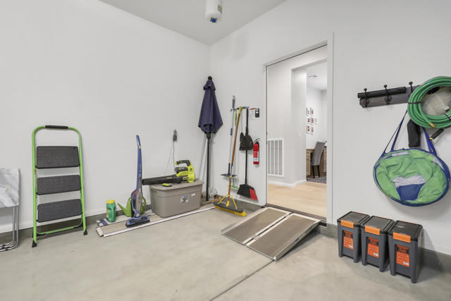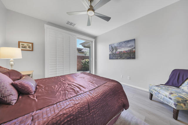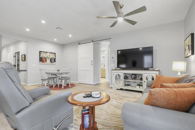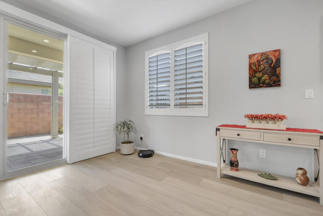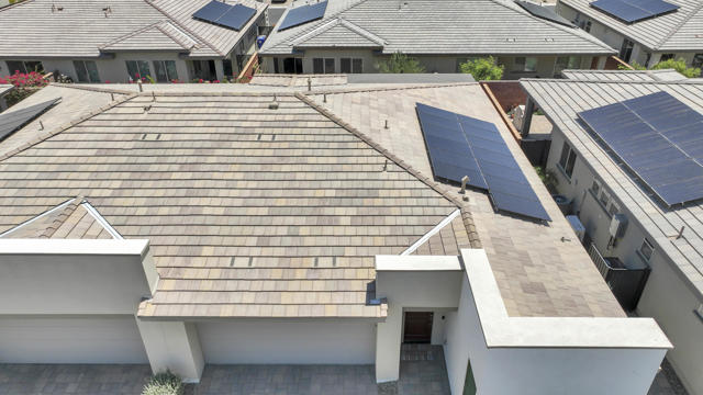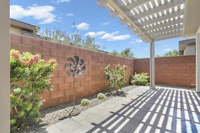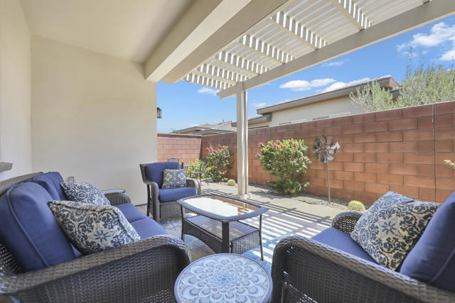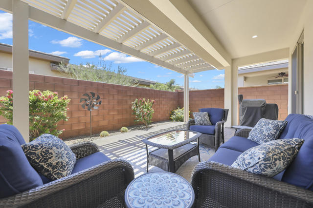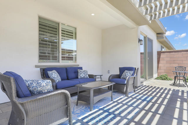This Aria floor plan is smart-home equipped, and includes accessibility enhancements such as a roll-under vanity option and a dual-head shower. The primary suite is appointed with stylish barn doors and a sliding glass door offering direct access to the backyard. Interior upgrades include luxury vinyl flooring, vinyl shutters, a stackable washer and dryer, a 3D stone backsplash, a custom built-in closet, and additional recessed lighting in both the dining area and primary suite. The chef's kitchen opens to expansive indoor-outdoor living, highlighted by an Alumawood covered patio, new screen doors, and a retractable front entry screen. A solar lease at approximately $60 per month and a new AC condenser installed in 2024, providing year-round comfort and efficiency. Enjoy refined desert living within a welcoming resort-style community. Club membership is available for transfer ($3,000 transfer fee versus $20,000 for new membership) and offers access to exceptional amenities, including June Hill's Table dining, a wellness and fitness center, culinary and art studios, lap and lounge pools with spa, an indoor golf simulator, billiards, shuffleboard, and courts for tennis, pickleball, and bocce. Experience the lifestyle, comfort, and community this home has to offer.