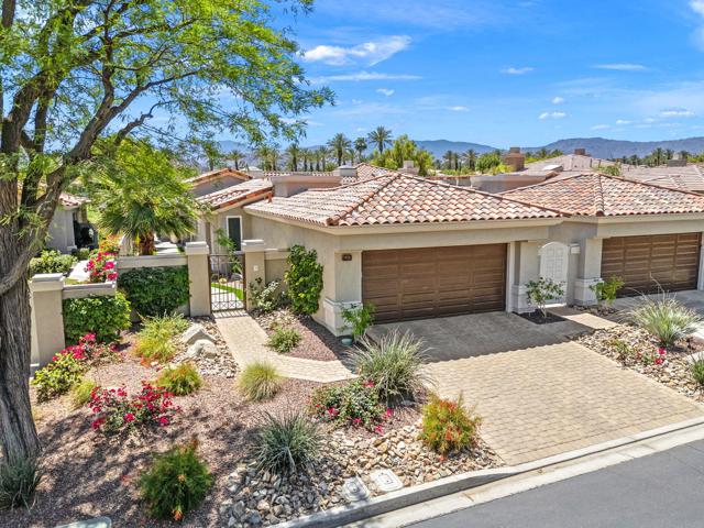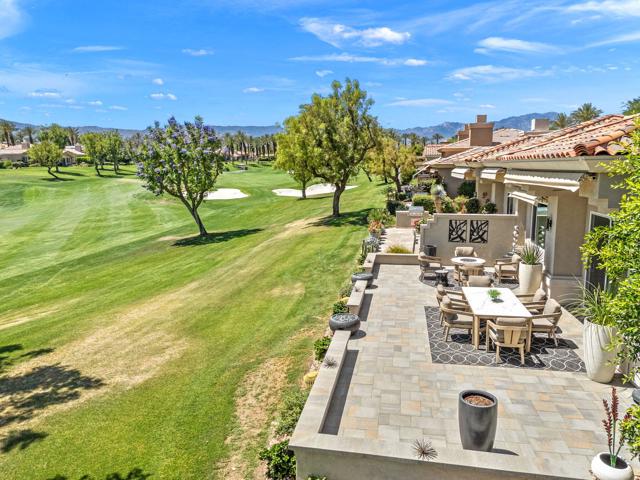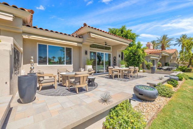 Reimagined and completely remodeled from top to bottom, this stunning Acacia 3 floor plan has been transformed into a sophisticated modern desert retreat. Walls have been removed to create an open, light-filled layout, and an additional powder bath has been thoughtfully added for enhanced functionality and effortless entertaining. From the moment you arrive, you'll appreciate the upgraded paver driveway, courtyard, and back patio, along with beautifully redesigned courtyard landscaping that sets the tone for seamless indoor-outdoor living. A custom front door makes a striking first impression and welcomes you into the home. Inside, luxury vinyl flooring flows throughout, complementing the reimagined kitchen featuring brand-new custom cabinetry, quartz countertops, and a full suite of new appliances, including a built-in Bosch espresso machine. The living room showcases a sleek electric fireplace and opens effortlessly to the outdoor spaces, perfectly positioned to capture desirable south-facing mountain views, and overlooks the 7th hole of The Grove course. The primary suite is a true showpiece, offering a spa-inspired bathroom with all-new cabinetry, quartz countertops, updated sinks and fixtures, a walk-in shower, and a bonus custom-designed closet. Two well-appointed guest bedrooms share a beautifully updated bath, providing comfortable and stylish accommodations for family and guests. Throughout the home, modern ceiling fans, designer sconces, and LED lighting create a warm yet contemporary ambiance. Even the laundry room has been thoughtfully designed with stylish finishes and functional upgrades that elevate everyday living. A newer air conditioning system adds year-round comfort and efficiency as well as all brand-new windows and sliders throughout the home. This is a rare opportunity to own a fully reimagined Acacia 3, offering high-end finishes, modern design, and exceptional attention to detail in one of Indian Ridge's most desirable settings. Home is being offered furnished per inventory. Club membership available or golf membership available per the waitlist.