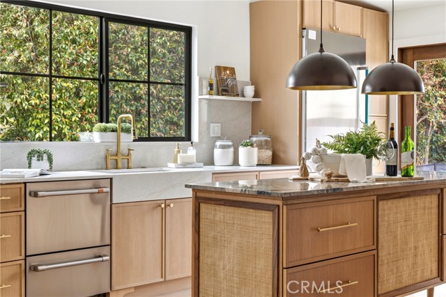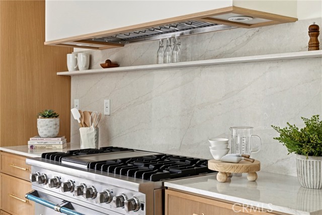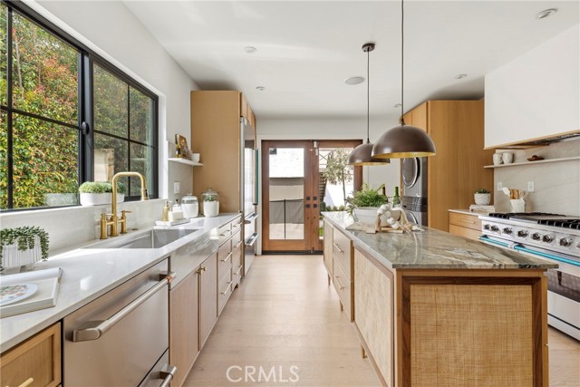 Inside, the home showcases white oak floors, new custom kitchen cabinetry, and a true chef’s kitchen outfitted with a 48-inch Viking range and refrigerator. The open living spaces flow seamlessly to the outdoors, creating a natural connection between indoor comfort and outdoor living.