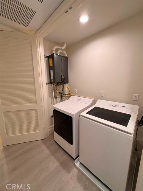 The unit comes equipped with a side-by-side washer and dryer, high-end refrigerator, dishwasher, and microwave.