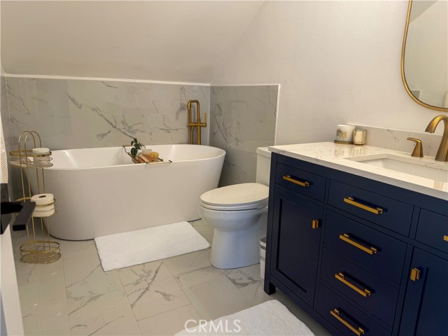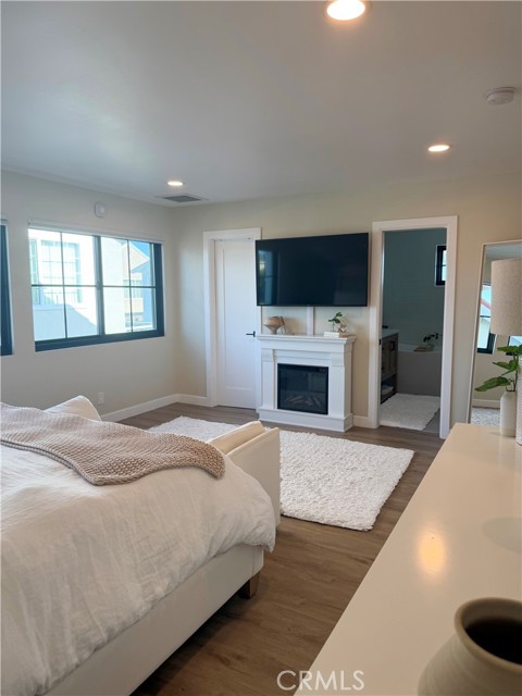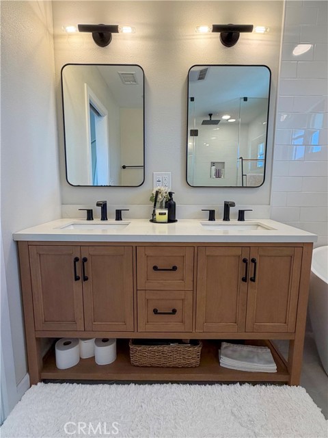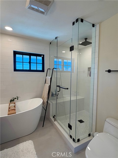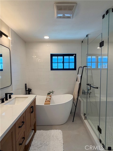 The spacious primary suite features a relaxing retreat with a walk-in closet and a beautifully upgraded bathroom featuring dual sinks, a soaking tub, and a separate walk-in shower.