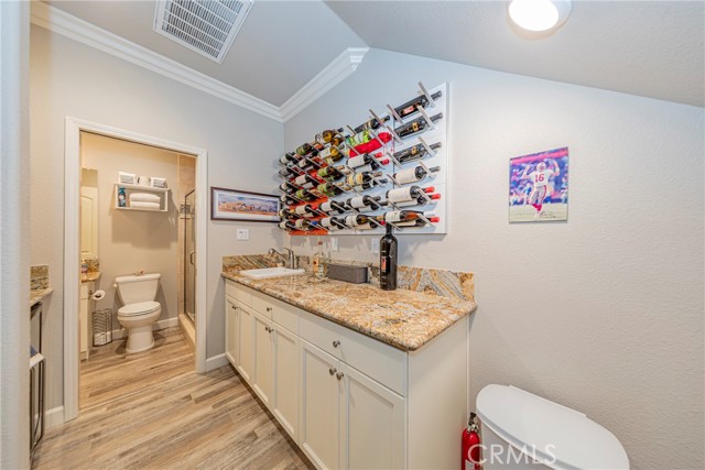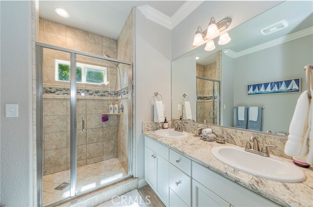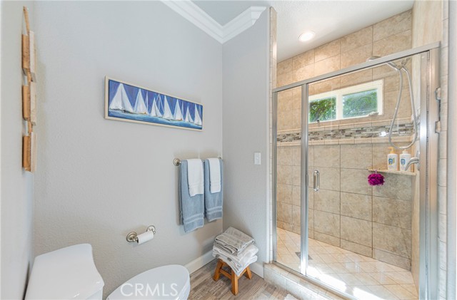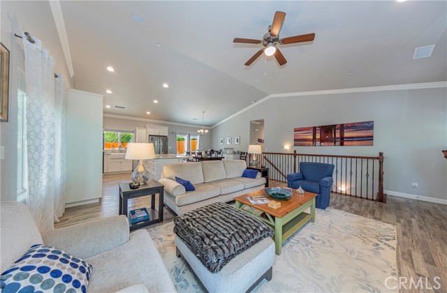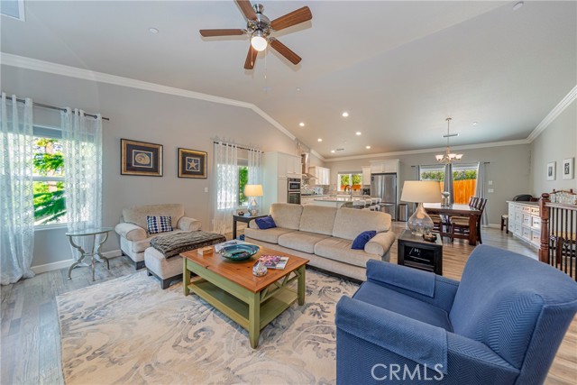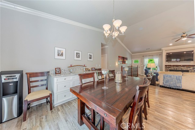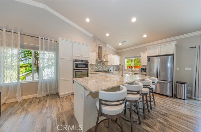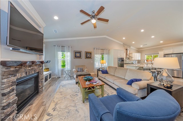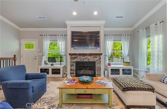 The main living area upstairs showcases soaring vaulted ceilings, elegant crown molding, and a cozy fireplace framed by custom-built window benches. A fully integrated sound system is hardwired throughout the home, delivering premium audio in every room, along with a high-tech security system for added peace of mind.