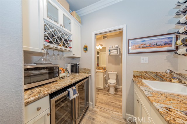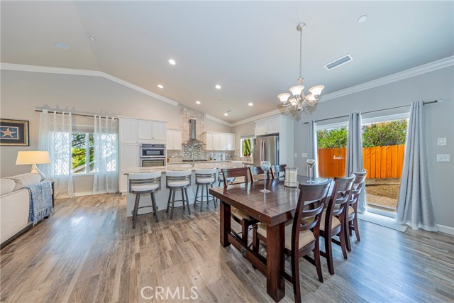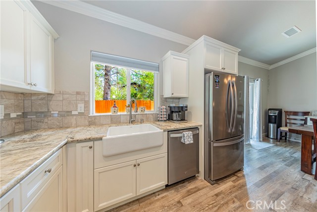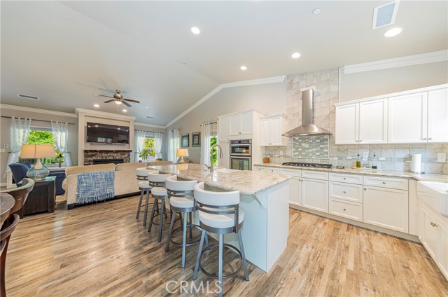 The modern kitchen is both stylish and functional, featuring crisp white cabinetry, upgraded custom granite countertops, and a deep farmhouse sink. The expansive island includes a vegetable sink, built-in wine refrigerator, and bar seating perfect for entertaining. The open-concept layout flows seamlessly into the dining and living areas, highlighted by a built-in credenza for additional storage and display.