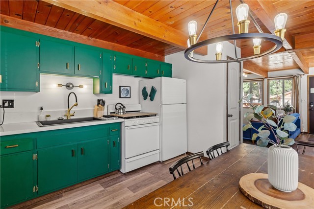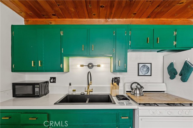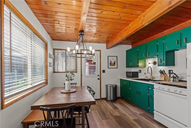 The kitchen is equipped with a gas stove, oven, microwave, ample cabinetry, and an adjacent dining area that works equally well for everyday living or entertaining.