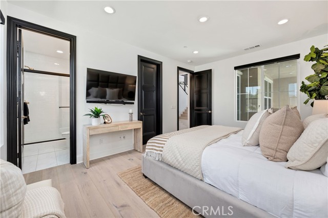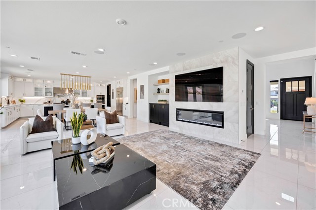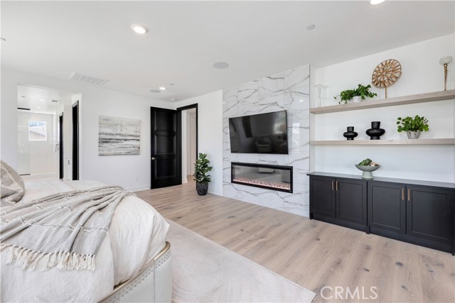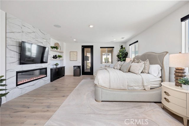 Surfaces have been carefully selected, featuring extensive quartz installations across the kitchen, baths, and wet bar, complemented by full-height tilework and statement fireplace surrounds that anchor each living space with warmth and texture. Upgraded wood and tile flooring flows throughout, creating a cohesive and elevated finish rarely achieved in new construction.