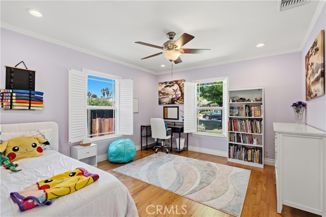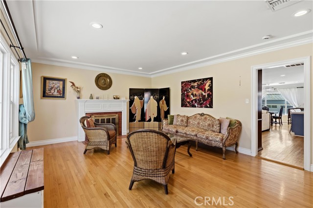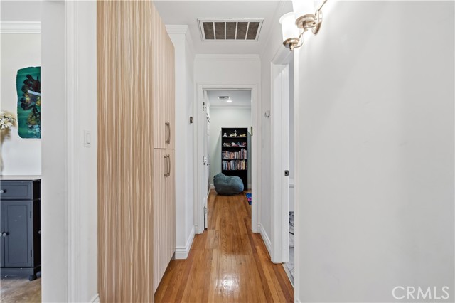 The floor plan is smartly laid out in two separate wings featuring original hardwood flooring throughout. The front wing offers two comfortable bedrooms and a full bath, ideal for a quiet home office or guest space. The rear wing provides extra peace and quiet with two separate primary suites, both featuring their own en-suite bathrooms. For even more flexibility, the converted garage serves as a finished studio with its own 3/4 bath—ideal for a home gym, creative workspace, or a convenient pool house.