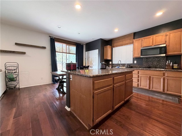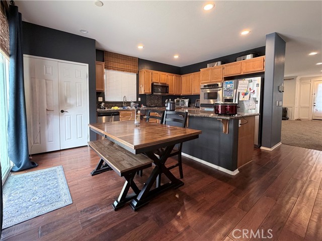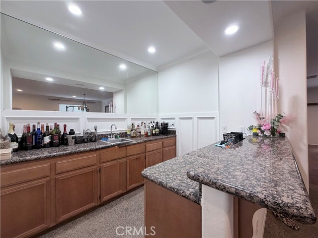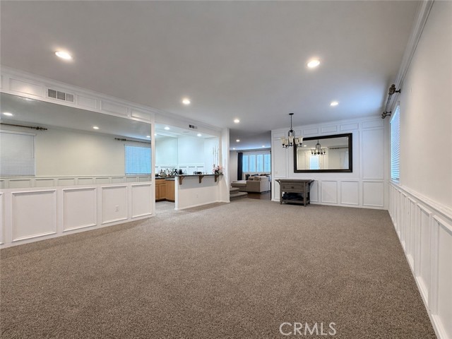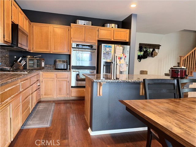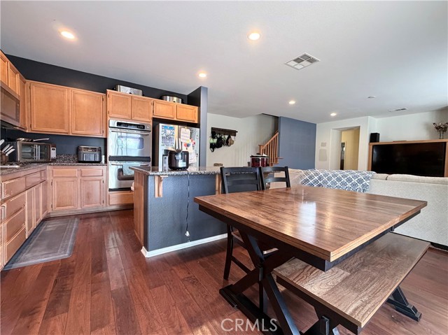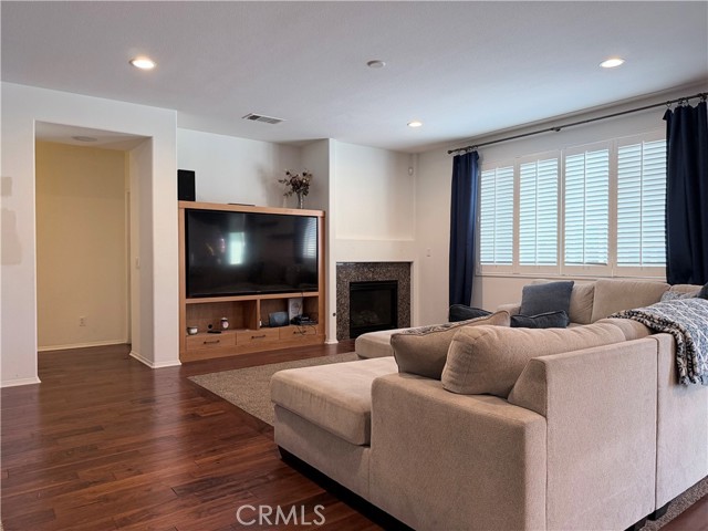 The main level offers wood flooring throughout and includes a combined living and dining room enhanced with wainscoting for added character and style. Just off the dining area is a large wet bar with ample room to mix drinks and serve guests, making it a great setup for entertaining. The open-concept kitchen features granite countertops, an eating island, and flows into the spacious family room with a gas fireplace, creating a warm and functional gathering space. The low-maintenance backyard offers added privacy with no rear neighbors, and the home also includes solar for added efficiency and long term value.