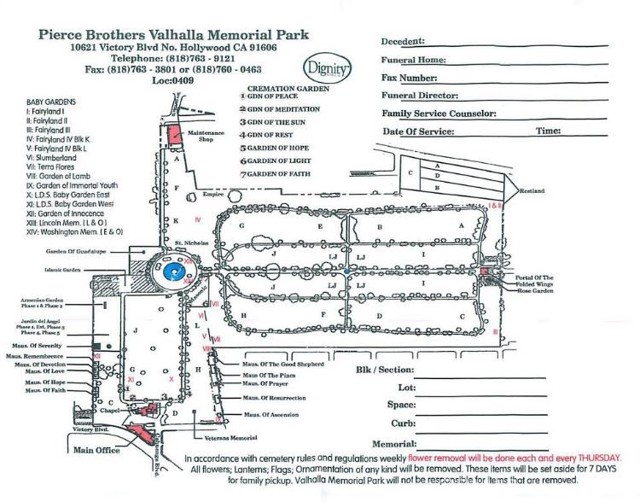 A rare opportunity to secure a final resting place in the highly sought-after Pierce Brothers Valhalla Memorial Park, one of North Hollywood’s most historic and beautifully maintained cemeteries. This single burial plot offers a serene, dignified setting surrounded by mature trees, manicured grounds, and the timeless character that has made Valhalla a cherished choice for generations.