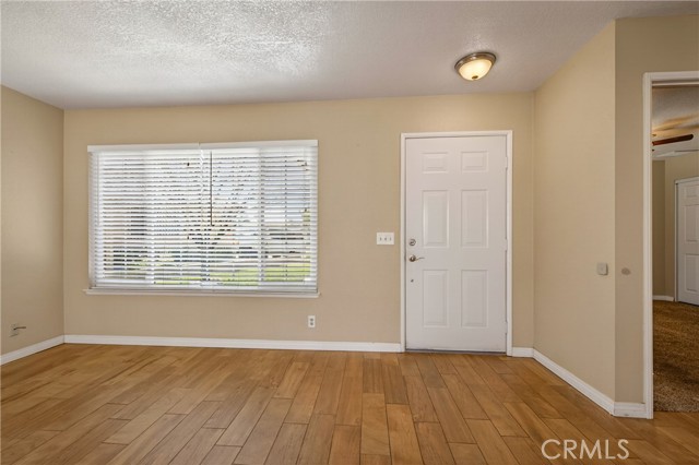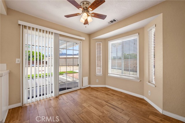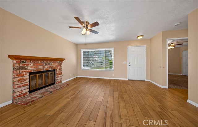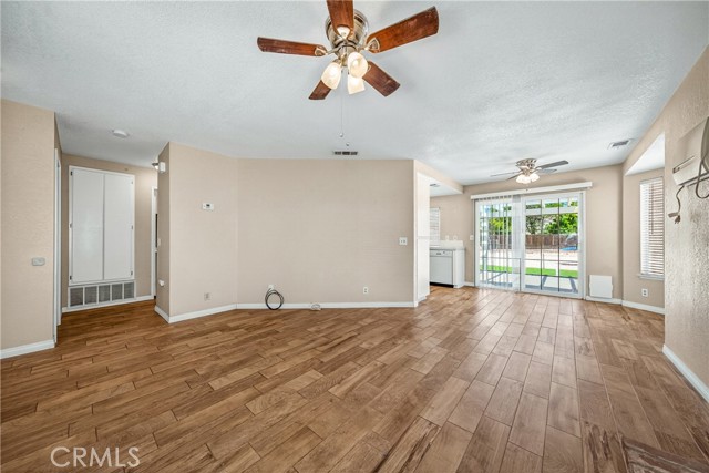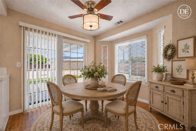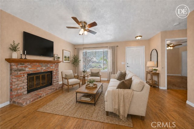 Inside, the living room, dining area, and kitchen feature stylish wood-look tile flooring, creating a cohesive and modern feel throughout the main living areas. The inviting living room includes a cozy gas fireplace and flows seamlessly into the dining area which is complete with a ceiling fan and sliding glass door leading to a Aluma wood covered patio—perfect for indoor-outdoor living.