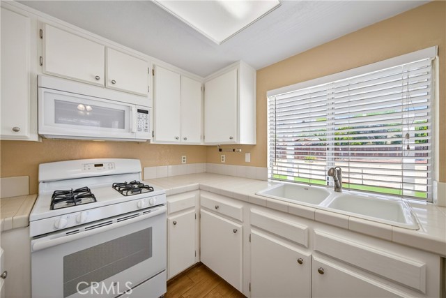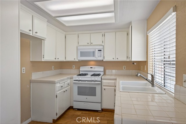 The bright kitchen opens to the dining space and is equipped with a stove, microwave, dishwasher, and tile countertops, offering both functionality and charm.
