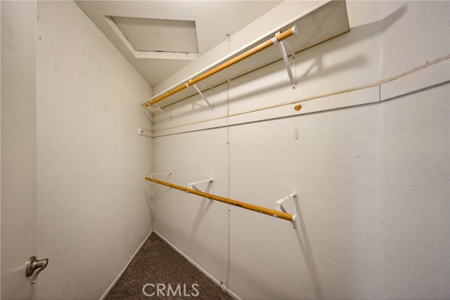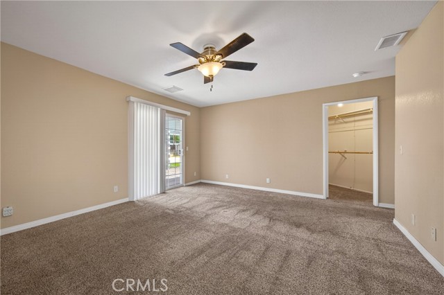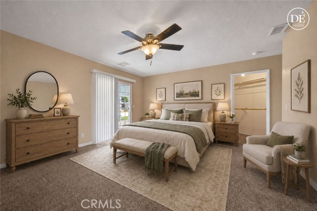 The spacious primary suite features carpet flooring, a ceiling fan, a walk-in closet, and a sliding glass door with direct access to the Aluma wood covered patio. The en-suite bathroom includes dual sinks, a walk-in shower, ceramic tile flooring, and a convenient linen closet.