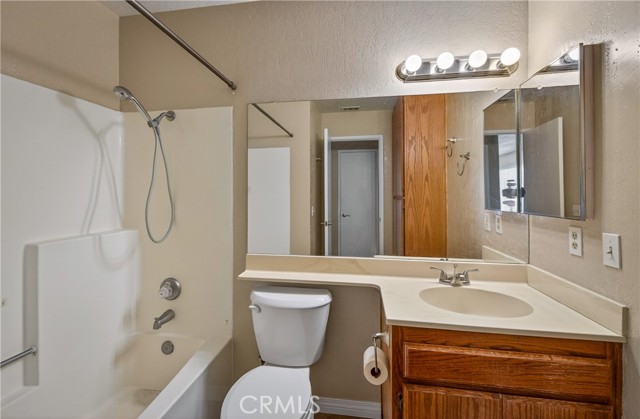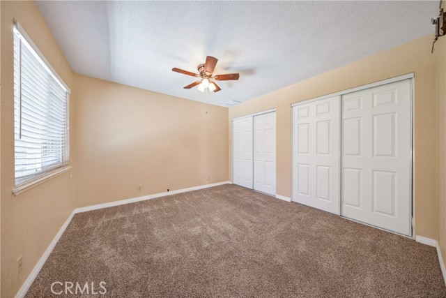 The second bedroom offers carpet, a ceiling fan, and two closets for ample storage. The secondary bathroom includes tile flooring, a single vanity, and a shower-over-tub combination.