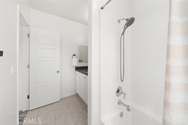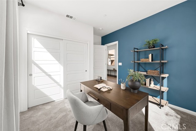 Through the front entrance, you are ushered into a thoughtfully designed floor plan featuring a downstairs bedroom—currently staged as an office—alongside a full bathroom with a walk-in shower and linen storage, ideal for guests or flexible living.