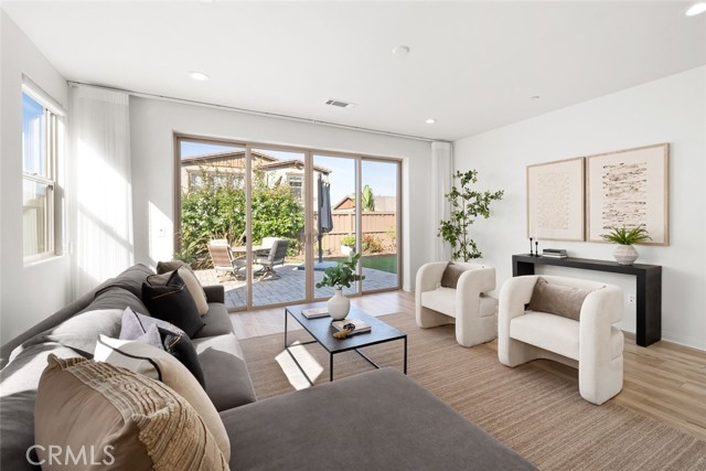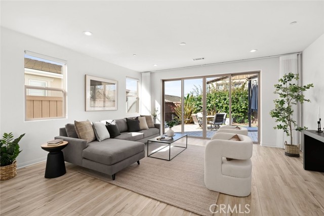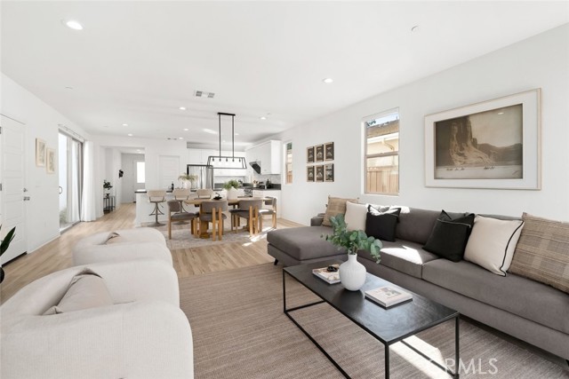 The hallway opens to a bright, open-concept living space anchored by a stunning kitchen with stainless steel appliances, a large center island with bar seating, and a walk-in pantry. Designer-selected lighting above the dining area adds sophistication and mood. The living room is filled with natural light and embraces indoor-outdoor living through glass sliders that open to a serene backyard retreat.