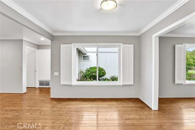 Hardwood floors and crown molding carry throughout the main living spaces, while double-pane windows paired with classic shutters bring in natural light with a touch of timeless style. The kitchen offers a crisp, clean aesthetic with granite countertops, a full backsplash, white cabinetry with soft-close drawers, and stainless steel appliances ready for everything from casual mornings to lively evenings. A recently updated HVAC system, including ducting, adds a valuable upgrade already in place.