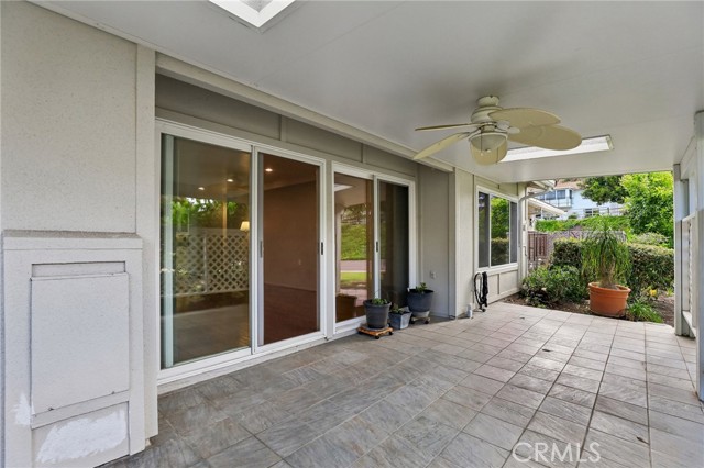 The living room and dining area flow effortlessly into a bright, inviting space anchored by dual sliders that open to a covered patio—complete with skylights and a ceiling fan. Morning coffee, afternoon reads, evening gatherings… it all just works out here. Built-ins in the family room add both charm and function (because storage should look good too).