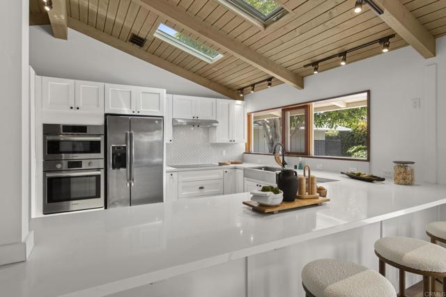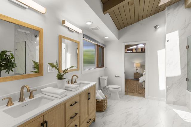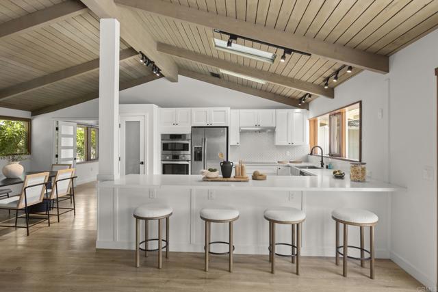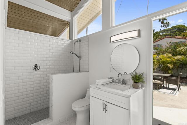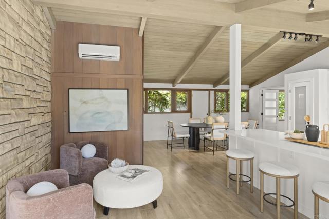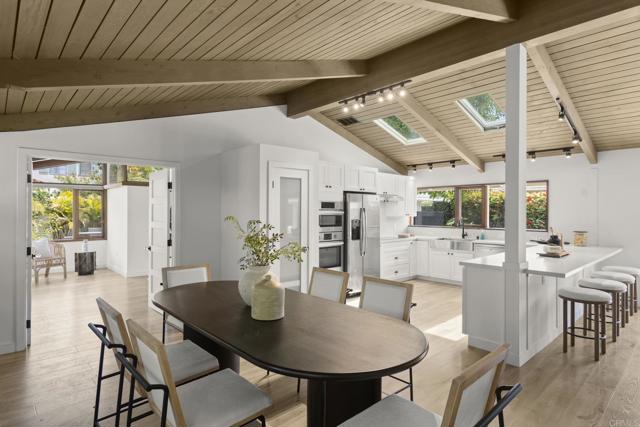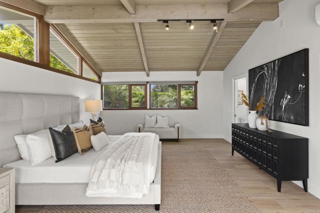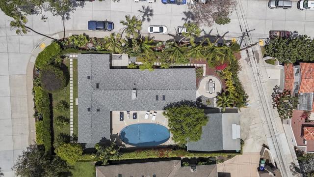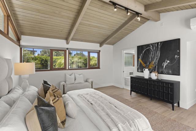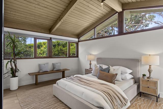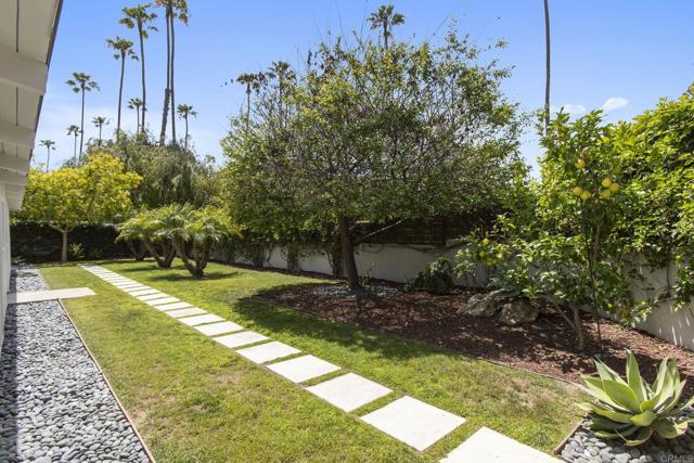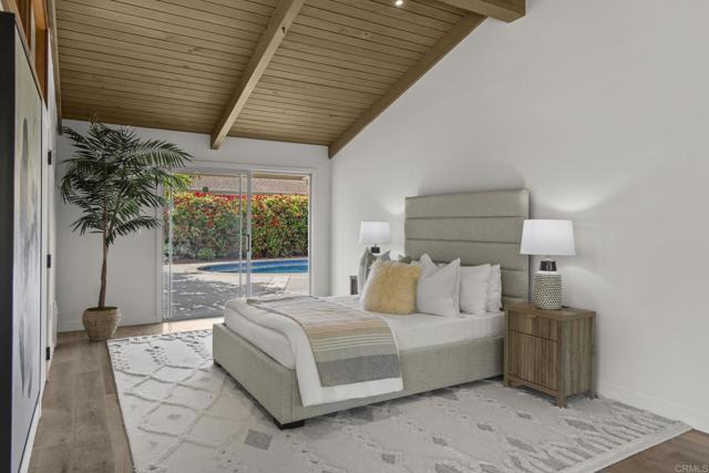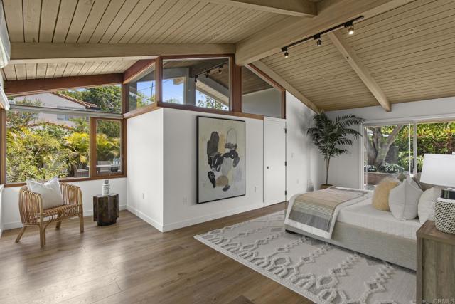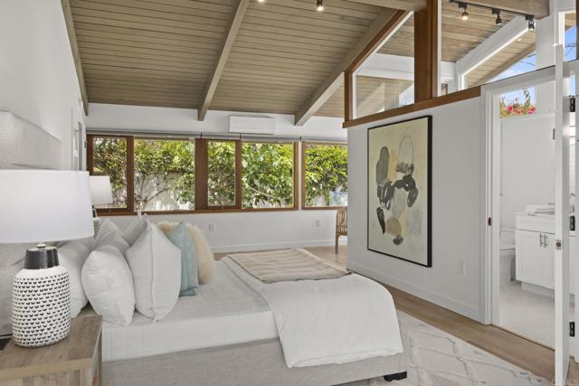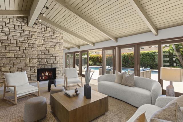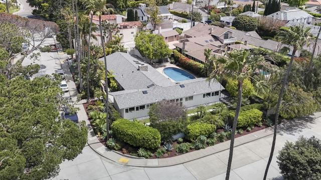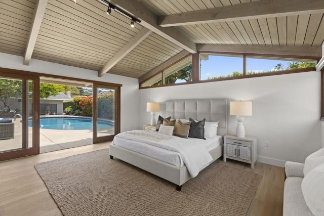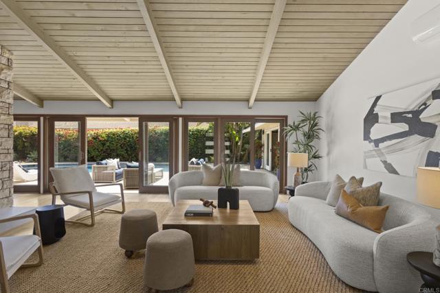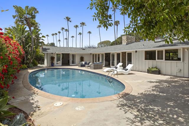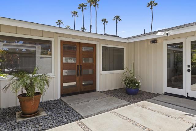 Tucked into a lush, privately gated corner lot in La Jolla’s coveted Lower Hermosa neighborhood, just blocks from Windansea Beach, 375 Via Del Norte offers a timeless take on Mid-Century Modern living with effortless coastal appeal. Vaulted, wood-beamed ceilings and expansive walls of glass invite natural light to pour into the home’s generous living spaces, creating a warm, airy ambiance throughout. The thoughtfully designed floorplan offers 4 bedrooms and 3.5 baths in the main residence, including two private primary suites—each with direct access to the backyard retreat. Every bedroom enjoys direct access to a bathroom, providing comfort and privacy for both residents and guests. At the heart of the home, indoor and outdoor living seamlessly converge. Sliding doors open to a serene backyard oasis anchored by an oval, in-ground pool, surrounded by mature landscaping and multiple lounging and entertaining areas. A dedicated dining patio offers the perfect setting for al fresco evenings, while a separate grassy yard provides space to relax or play. A detached junior casita with its own bedroom and bath adds exceptional versatility—ideal for guests, a home office, or wellness space. Additional highlights include a spacious laundry room, powder bath, detached two-car garage, and convenient off-street parking with alley access. Originally designed in 1954 by Mid-Century Modern architect Fred Earl Norris—who collaborated with Richard Neutra, Frederick Liebhardt, and Henry Hester—this home carries a rich architectural legacy. Paired with its seamless indoor-outdoor flow and premier coastal location, it presents a rare opportunity to own a true piece of La Jolla history, thoughtfully suited for modern living.